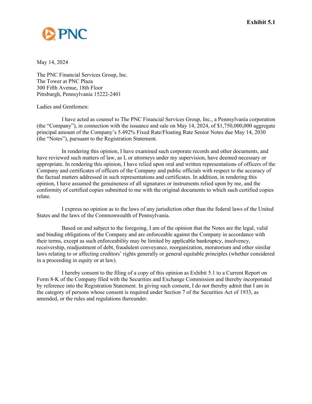 Exhibit 5.1 May 14, 2024 The PNC Financial Services Group, Inc. The Tower at PNC Plaza 300 Fifth Avenue, 18th Floor Pittsburgh, Pennsylvania 15222-2401 Ladies and Gentlemen: I have acted as counsel to The PNC Financial Services Group, Inc., a Pennsylvania corporation (the “Company”), in connection with the issuance and sale on May 14, 2024, of $1,750,000,000 aggregate principal amount of the Company’s 5.492% Fixed Rate/Floating Rate Senior Notes due May 14, 2030 (the “Notes”), pursuant to the Registration Statement. In rendering this opinion, I have examined such corporate records and other documents, and have reviewed such matters of law, as I, or attorneys under my supervision, have deemed necessary or appropriate. In rendering this opinion, I have relied upon oral and written representations of officers of the Company and certificates of officers of the Company and public officials with respect to the accuracy of the factual matters addressed in such representations and certificates. In addition, in rendering this opinion, I have assumed the genuineness of all signatures or instruments relied upon by me, and the conformity of certified copies submitted to me with the original documents to which such certified copies relate. I express no opinion as to the laws of any jurisdiction other than the federal laws of the United States and the laws of the Commonwealth of Pennsylvania. Based on and subject to the foregoing, I am of the opinion that the Notes are the legal, valid and binding obligations of the Company and are enforceable against the Company in accordance with their terms, except as such enforceability may be limited by applicable bankruptcy, insolvency, receivership, readjustment of debt, fraudulent conveyance, reorganization, moratorium and other similar laws relating to or affecting creditors’ rights generally or general equitable principles (whether considered in a proceeding in equity or at law). I hereby consent to the filing of a copy of this opinion as Exhibit 5.1 to a Current Report on Form 8-K of the Company filed with the Securities and Exchange Commission and thereby incorporated by reference into the Registration Statement. In giving such consent, I do not thereby admit that I am in the category of persons whose consent is required under Section 7 of the Securities Act of 1933, as amended, or the rules and regulations thereunder.
