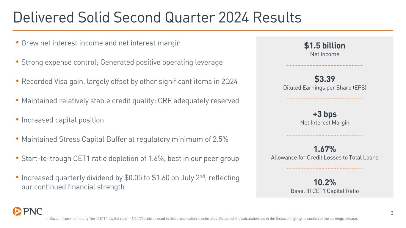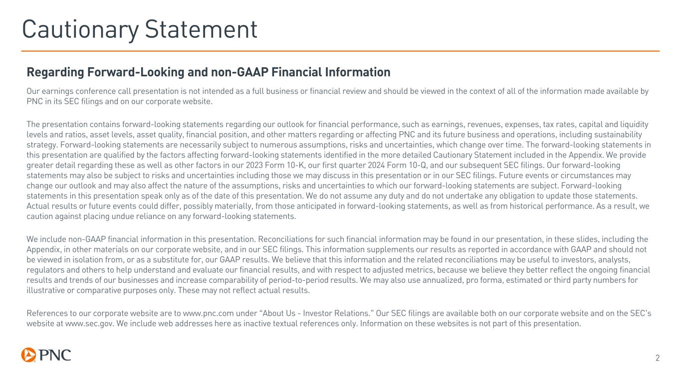 Regarding Forward-Looking and non-GAAP Financial Information Our earnings conference call presentation is not intended as a full business or financial review and should be viewed in the context of all of the information made available by PNC in its SEC filings and on our corporate website. The presentation contains forward-looking statements regarding our outlook for financial performance, such as earnings, revenues, expenses, tax rates, capital and liquidity levels and ratios, asset levels, asset quality, financial position, and other matters regarding or affecting PNC and its future business and operations, including sustainability strategy. Forward-looking statements are necessarily subject to numerous assumptions, risks and uncertainties, which change over time. The forward-looking statements in this presentation are qualified by the factors affecting forward-looking statements identified in the more detailed Cautionary Statement included in the Appendix. We provide greater detail regarding these as well as other factors in our 2023 Form 10-K, our first quarter 2024 Form 10-Q, and our subsequent SEC filings. Our forward-looking statements may also be subject to risks and uncertainties including those we may discuss in this presentation or in our SEC filings. Future events or circumstances may change our outlook and may also affect the nature of the assumptions, risks and uncertainties to which our forward-looking statements are subject. Forward-looking statements in this presentation speak only as of the date of this presentation. We do not assume any duty and do not undertake any obligation to update those statements. Actual results or future events could differ, possibly materially, from those anticipated in forward-looking statements, as well as from historical performance. As a result, we caution against placing undue reliance on any forward-looking statements. We include non-GAAP financial information in this presentation. Reconciliations for such financial information may be found in our presentation, in these slides, including the Appendix, in other materials on our corporate website, and in our SEC filings. This information supplements our results as reported in accordance with GAAP and should not be viewed in isolation from, or as a substitute for, our GAAP results. We believe that this information and the related reconciliations may be useful to investors, analysts, regulators and others to help understand and evaluate our financial results, and with respect to adjusted metrics, because we believe they better reflect the ongoing financial results and trends of our businesses and increase comparability of period-to-period results. We may also use annualized, pro forma, estimated or third party numbers for illustrative or comparative purposes only. These may not reflect actual results. References to our corporate website are to www.pnc.com under “About Us - Investor Relations.” Our SEC filings are available both on our corporate website and on the SEC’s website at www.sec.gov. We include web addresses here as inactive textual references only. Information on these websites is not part of this presentation. 2 Cautionary Statement