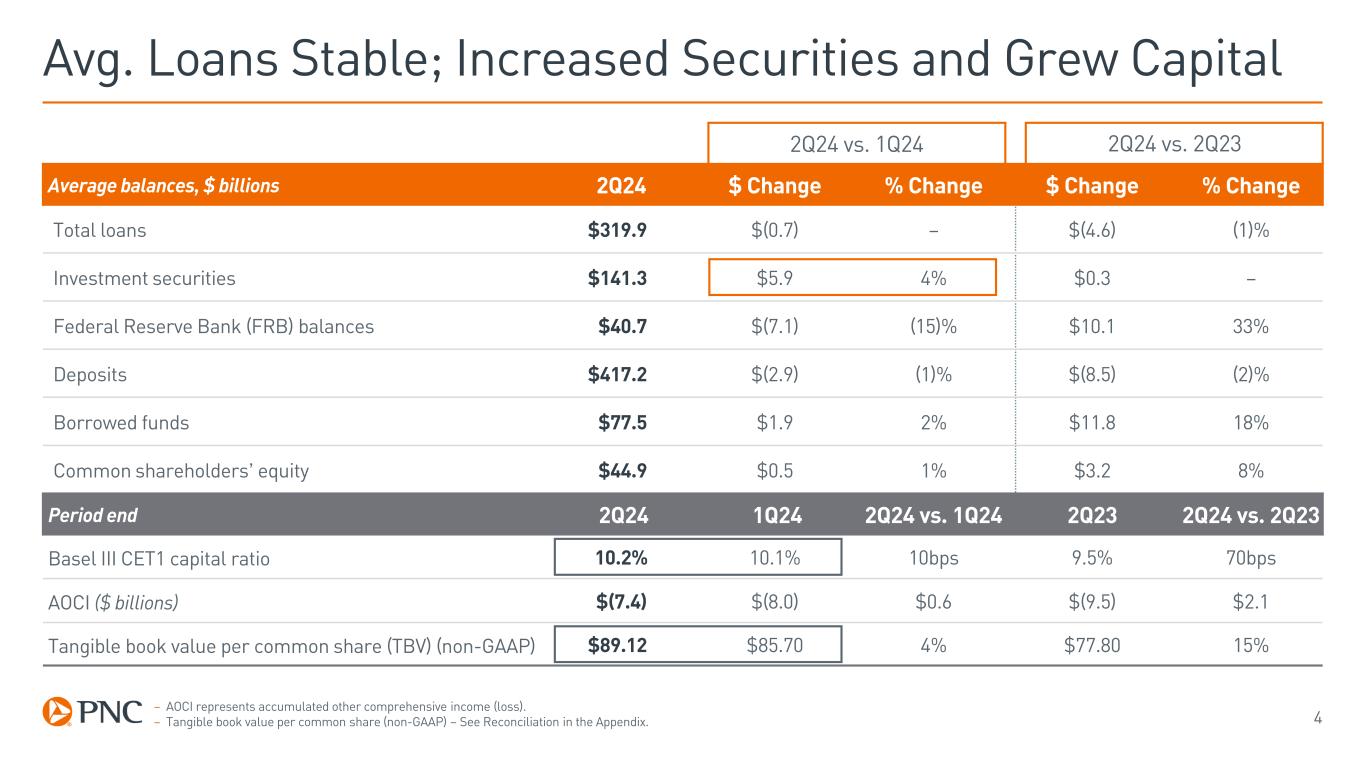 • Grew net interest income and net interest margin • Strong expense control; Generated positive operating leverage • Recorded Visa gain, largely offset by other significant items in 2Q24 • Maintained relatively stable credit quality; CRE adequately reserved • Increased capital position • Maintained Stress Capital Buffer at regulatory minimum of 2.5% • Start-to-trough CET1 ratio depletion of 1.6%, best in our peer group • Increased quarterly dividend by $0.05 to $1.60 on July 2nd, reflecting our continued financial strength 3 Delivered Solid Second Quarter 2024 Results $1.5 billion Net Income $3.39 Diluted Earnings per Share (EPS) +3 bps Net Interest Margin 1.67% Allowance for Credit Losses to Total Loans 10.2% Basel III CET1 Capital Ratio – Basel III common equity Tier (CET) 1 capital ratio – 6/30/24 ratio as used in this presentation is estimated. Details of the calculation are in the financial highlights section of the earnings release.
