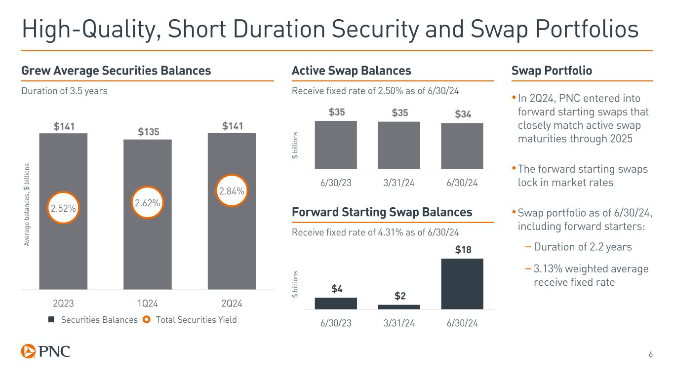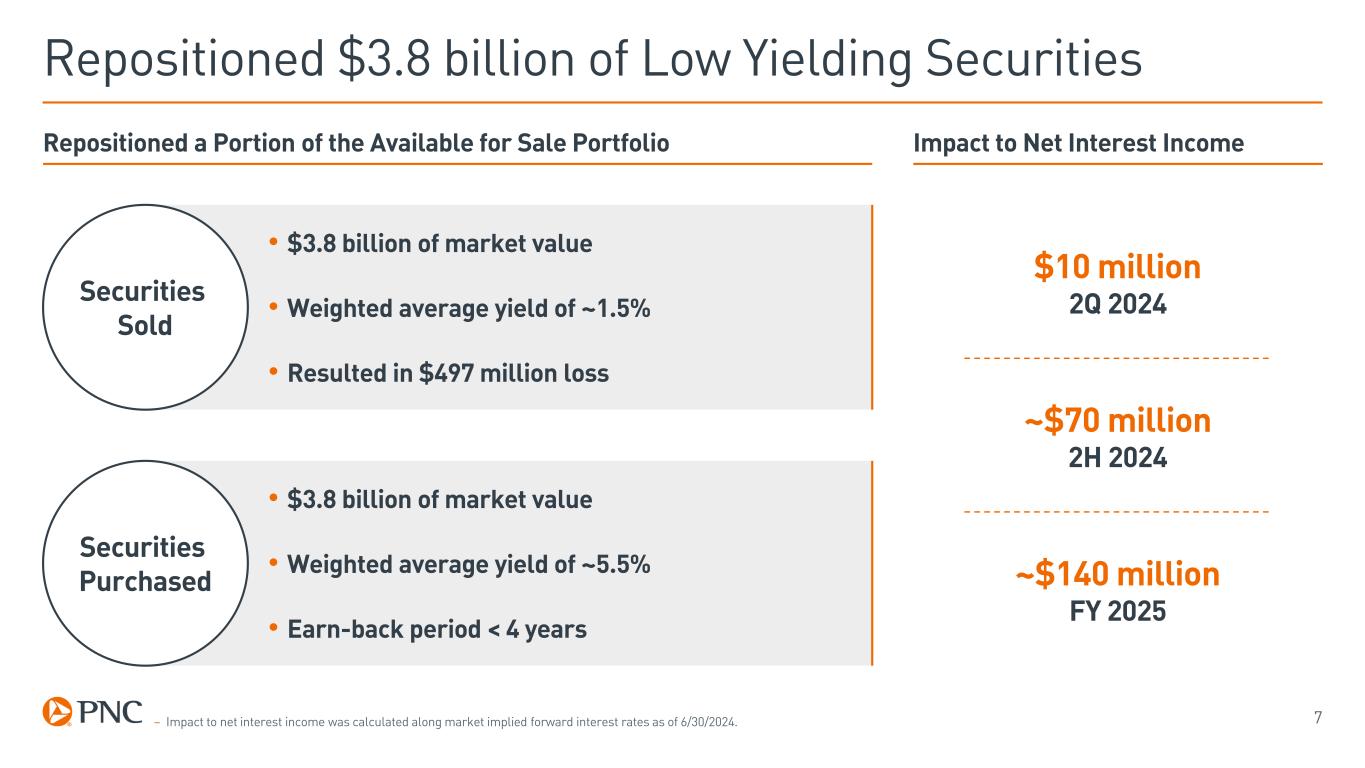 6 High-Quality, Short Duration Security and Swap Portfolios Grew Average Securities Balances Duration of 3.5 years $141 $135 $141 2.52% 2.62% 2.84% 2Q23 1Q24 2Q24 Av er ag e ba la nc es , $ b ill io ns Active Swap Balances $35 $35 $34 6/30/23 3/31/24 6/30/24 Forward Starting Swap Balances $4 $2 $18 6/30/23 3/31/24 6/30/24 Receive fixed rate of 2.50% as of 6/30/24 Total Securities YieldSecurities Balances • In 2Q24, PNC entered into forward starting swaps that closely match active swap maturities through 2025 •The forward starting swaps lock in market rates •Swap portfolio as of 6/30/24, including forward starters: – Duration of 2.2 years – 3.13% weighted average receive fixed rate Swap Portfolio $ bi lli on s $ bi lli on s Receive fixed rate of 4.31% as of 6/30/24