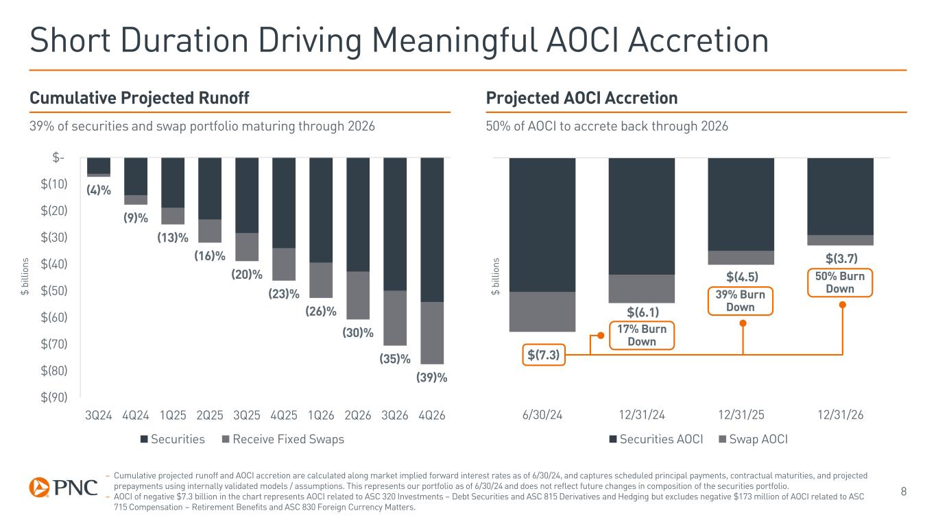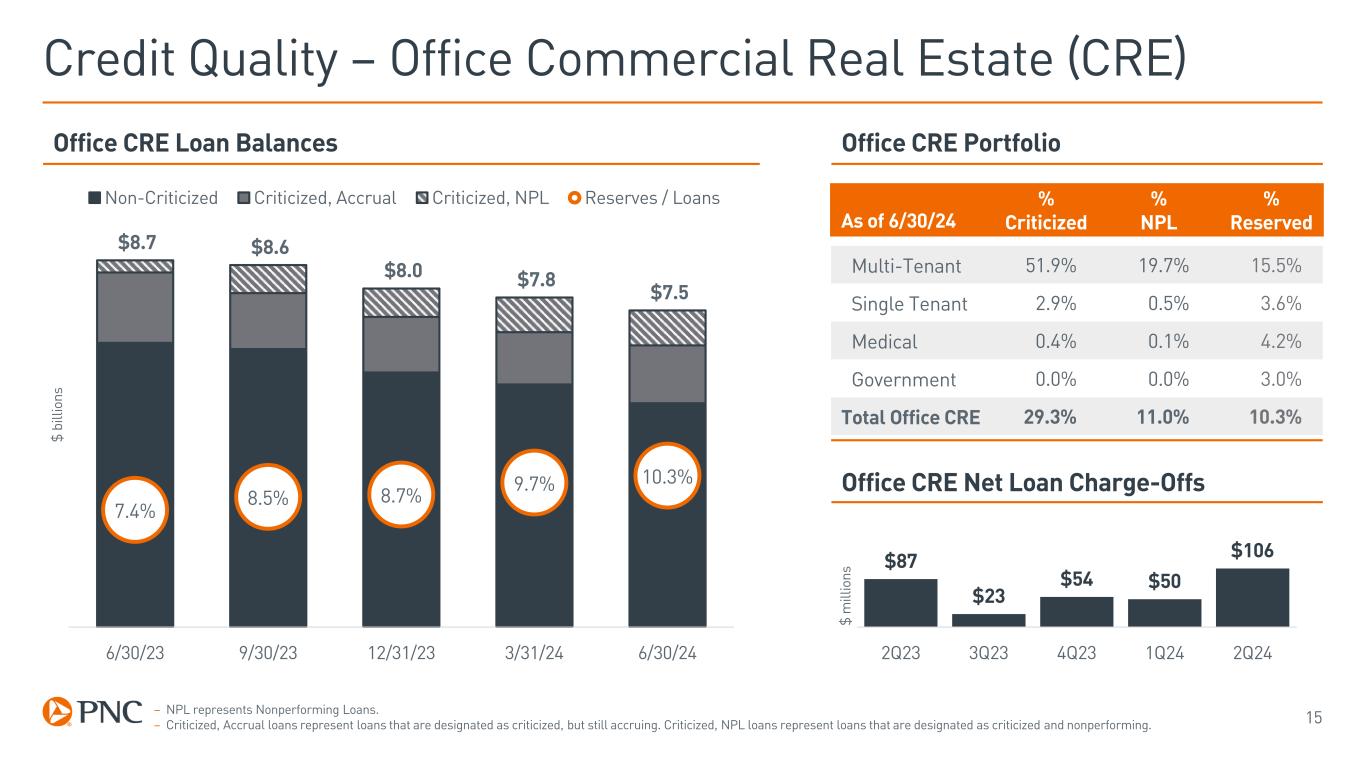Appendix: Office CRE Portfolio 23 – Totals may not sum due to rounding. – Average Loan Commitment for PNC Real Estate. – NCOs / Average loans represents net loan charge-offs to average loans for the last twelve-month period. – Delinquencies represent accruing loans past due 30 days or more. – NPL represents Nonperforming Loans. Multi- Tenant 55% Single- Tenant 17% Medical 16% Government 11% Other 1% $7.5 billion Suburban 42% Central Business District 29% Medical 16% Diversified 9% Other 4% $7.5 billion Tenant Classification Market Type Key Office Portfolio Metrics: Conservative Underwriting Methodology $ millions 6/30/24 3/31/24 Total Loans ($ billions) $7.5 $7.8 Avg. Loan Commitment $34 $35 Reserves / Loans 10.3% 9.7% NCOs / Average Loans 2.9% 2.6% Delinquencies / Loans 0.1% 0.0% NPL / Loans 11.0% 10.5% Criticized Loans / Loans 29.3% 26.4% Geographic Diversification by Metropolitan Statistical Area $ billions 6/30/24 Washington, DC $1.0 Los Angeles, CA 1.0 Dallas, TX 0.5 San Francisco, CA 0.3 New York, NY 0.3 San Diego, CA 0.3 Chicago, IL 0.3 Baltimore, MD 0.3 Boston, MA 0.2 Austin, TX 0.2 Other 3.2 Total $7.5