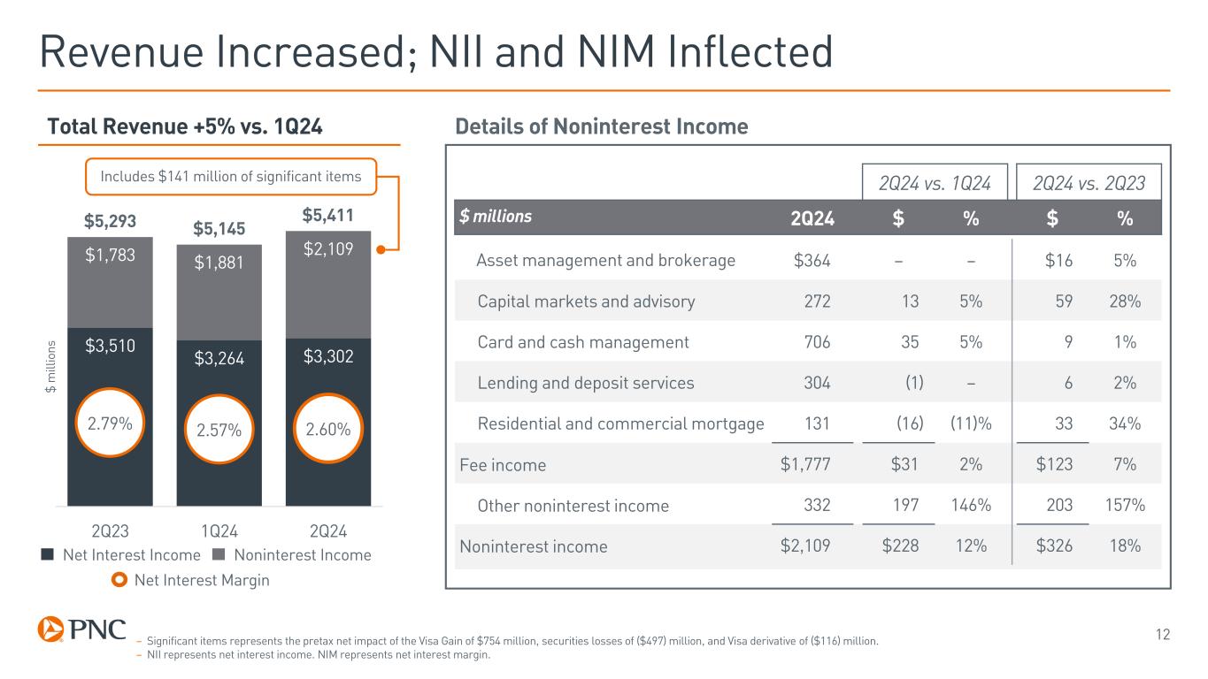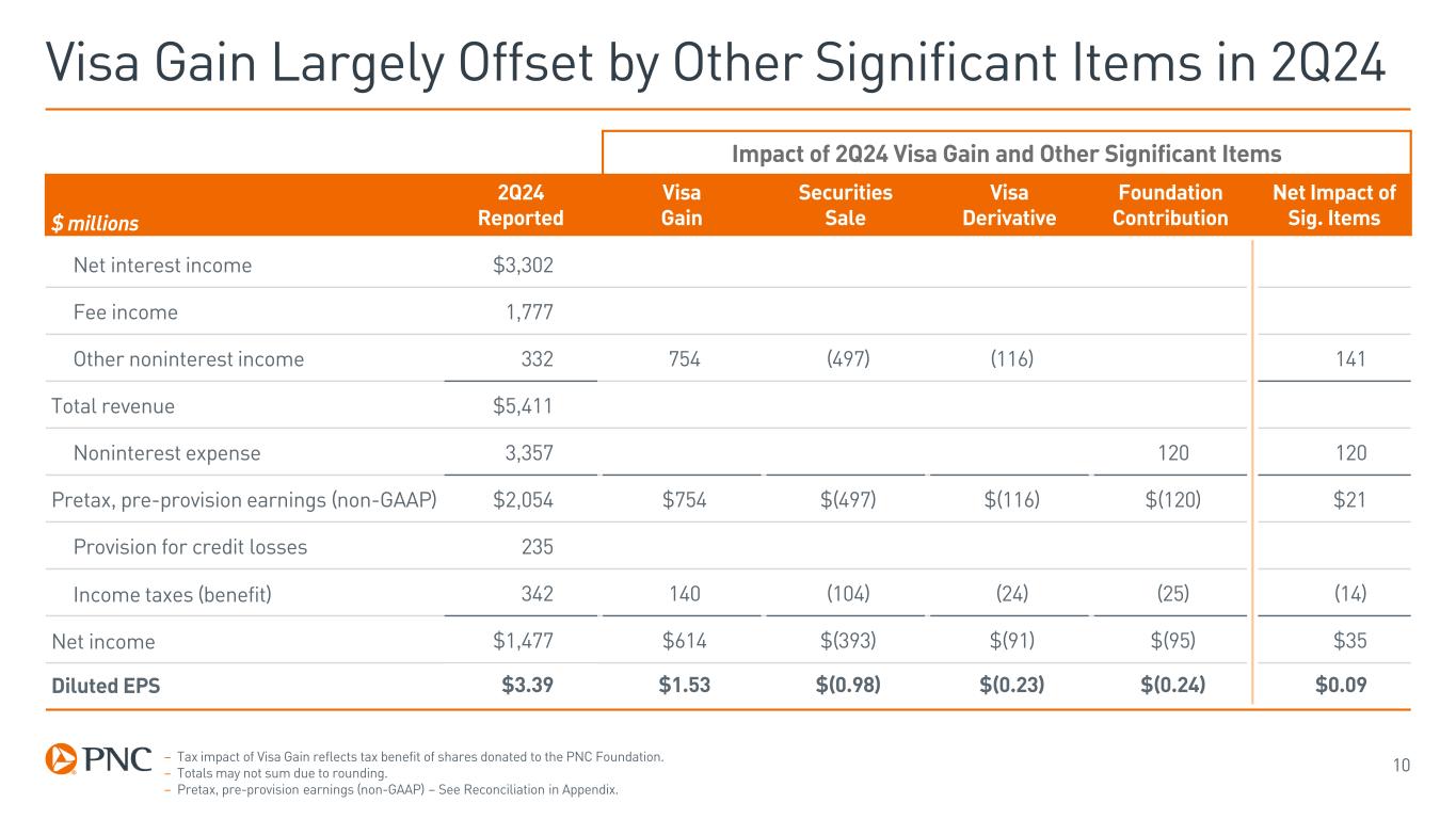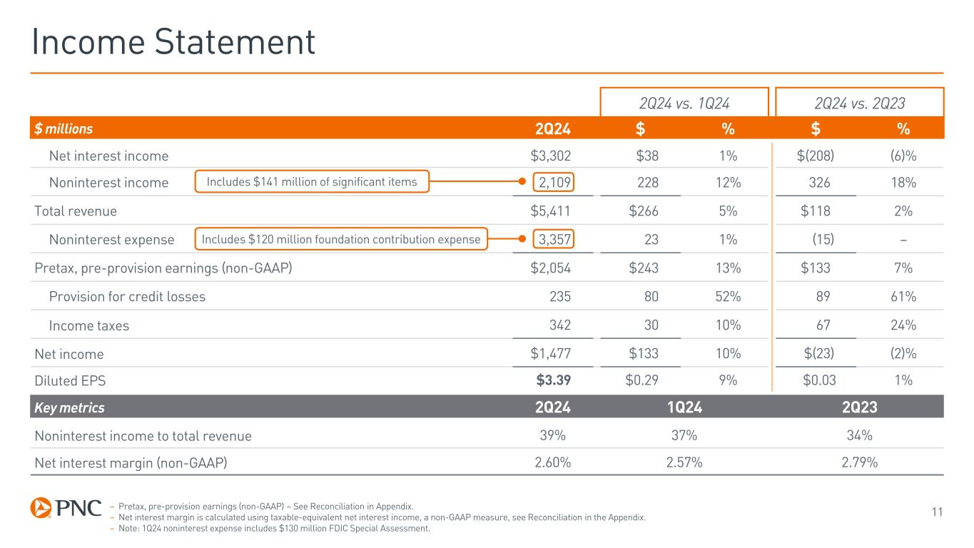 10 Visa Gain Largely Offset by Other Significant Items in 2Q24 Impact of 2Q24 Visa Gain and Other Significant Items $ millions 2Q24 Reported Visa Gain Securities Sale Visa Derivative Foundation Contribution Net Impact of Sig. Items Net interest income $3,302 Fee income 1,777 Other noninterest income 332 754 (497) (116) 141 Total revenue $5,411 Noninterest expense 3,357 120 120 Pretax, pre-provision earnings (non-GAAP) $2,054 $754 $(497) $(116) $(120) $21 Provision for credit losses 235 Income taxes (benefit) 342 140 (104) (24) (25) (14) Net income $1,477 $614 $(393) $(91) $(95) $35 Diluted EPS $3.39 $1.53 $(0.98) $(0.23) $(0.24) $0.09 – Tax impact of Visa Gain reflects tax benefit of shares donated to the PNC Foundation. – Totals may not sum due to rounding. – Pretax, pre-provision earnings (non-GAAP) – See Reconciliation in Appendix.