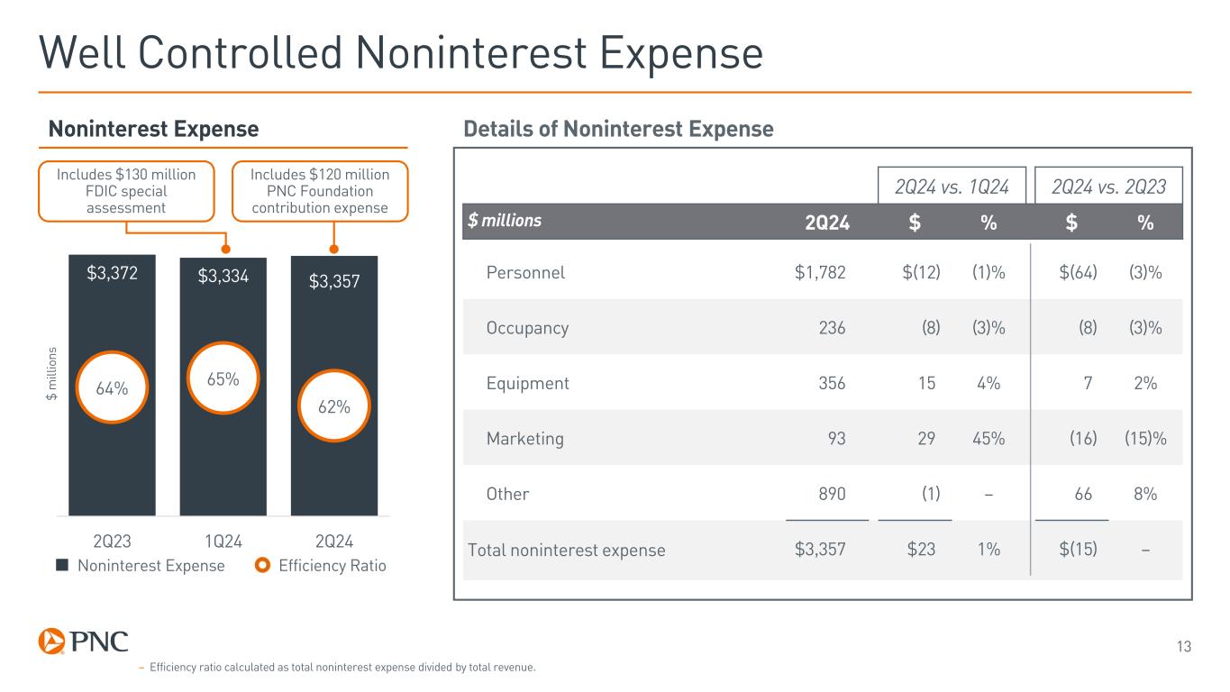 12 Revenue Increased; NII and NIM Inflected $3,510 $3,264 $3,302 $1,783 $1,881 $2,109 $5,293 $5,145 $5,411 2.79% 2.57% 2.60% 2Q23 1Q24 2Q24 Net Interest Margin Net Interest Income Noninterest Income Details of Noninterest Income 2Q24 vs. 1Q24 2Q24 vs. 2Q23 $ millions 2Q24 $ % $ % Asset management and brokerage $364 – – $16 5% Capital markets and advisory 272 13 5% 59 28% Card and cash management 706 35 5% 9 1% Lending and deposit services 304 (1) – 6 2% Residential and commercial mortgage 131 (16) (11)% 33 34% Fee income $1,777 $31 2% $123 7% Other noninterest income 332 197 146% 203 157% Noninterest income $2,109 $228 12% $326 18% Total Revenue +5% vs. 1Q24 $ m ill io ns – Significant items represents the pretax net impact of the Visa Gain of $754 million, securities losses of ($497) million, and Visa derivative of ($116) million. – NII represents net interest income. NIM represents net interest margin. Includes $141 million of significant items