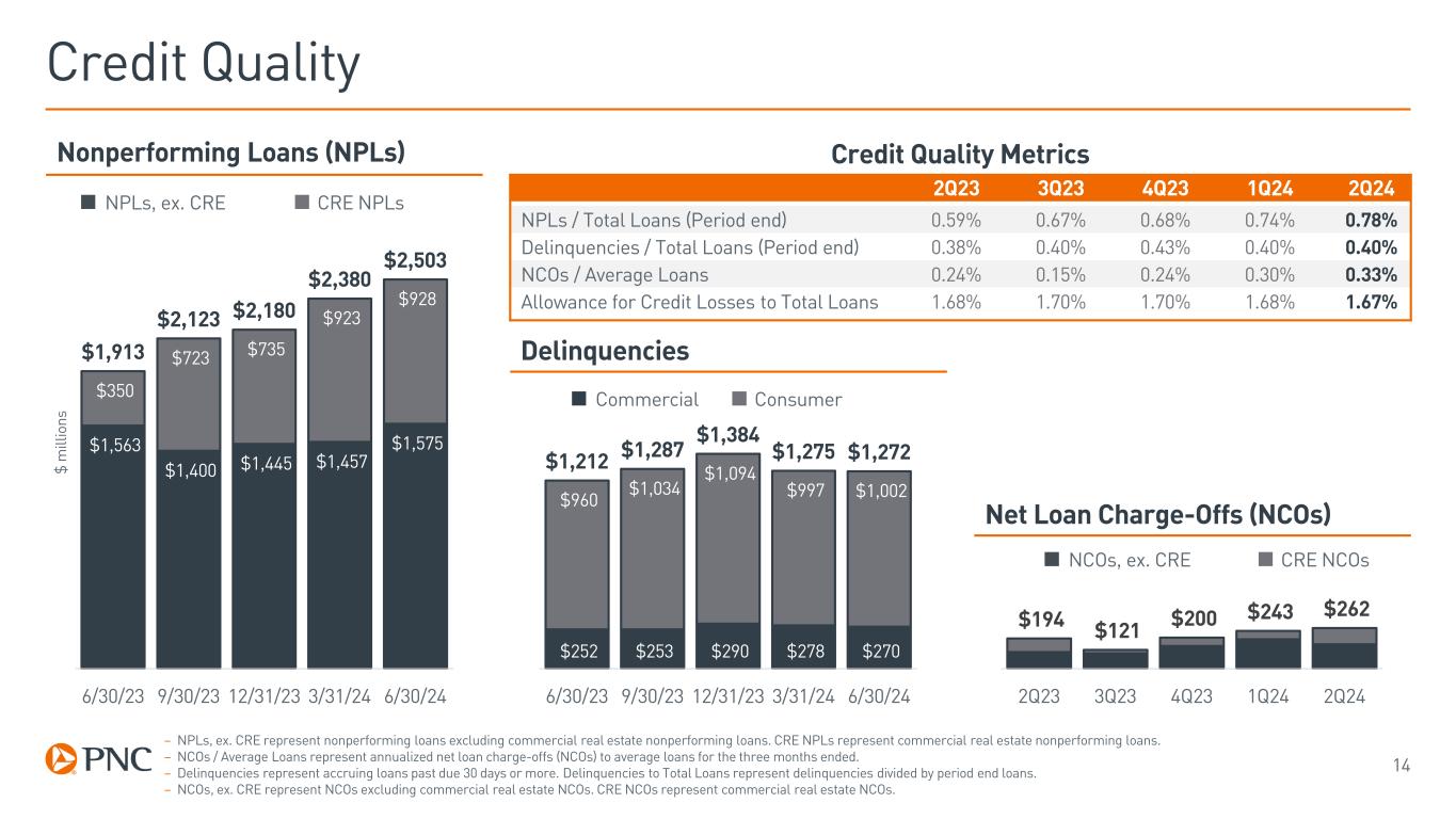$3,372 $3,334 $3,357 64% 65% 62% 2Q23 1Q24 2Q24 Includes $120 million PNC Foundation contribution expense 13 Well Controlled Noninterest Expense Noninterest Expense Details of Noninterest Expense 2Q24 vs. 1Q24 2Q24 vs. 2Q23 $ millions 2Q24 $ % $ % Personnel $1,782 $(12) (1)% $(64) (3)% Occupancy 236 (8) (3)% (8) (3)% Equipment 356 15 4% 7 2% Marketing 93 29 45% (16) (15)% Other 890 (1) – 66 8% Total noninterest expense $3,357 $23 1% $(15) – $ m ill io ns Includes $130 million FDIC special assessment Noninterest Expense Efficiency Ratio – Efficiency ratio calculated as total noninterest expense divided by total revenue.