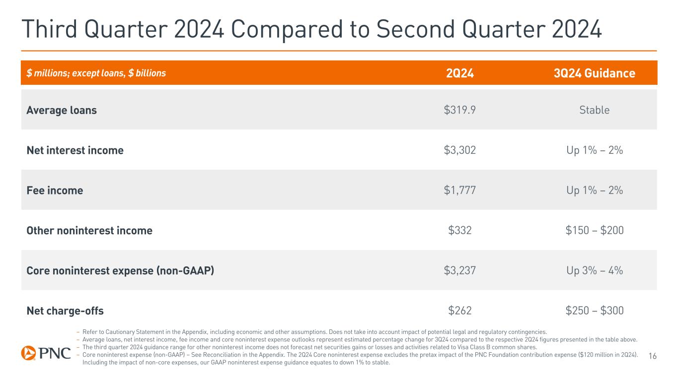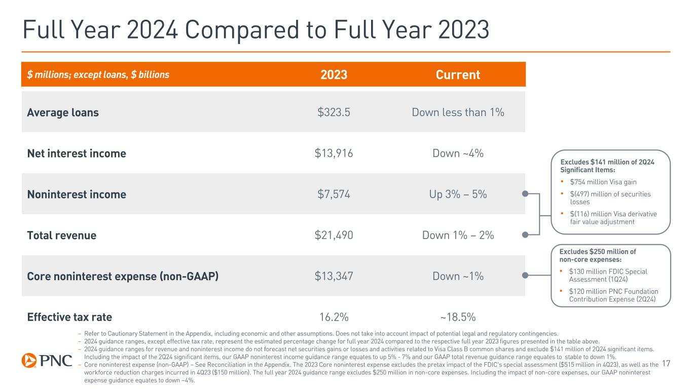 $ millions; except loans, $ billions 2Q24 3Q24 Guidance Average loans $319.9 Stable Net interest income $3,302 Up 1% – 2% Fee income $1,777 Up 1% – 2% Other noninterest income $332 $150 – $200 Core noninterest expense (non-GAAP) $3,237 Up 3% – 4% Net charge-offs $262 $250 – $300 16 Third Quarter 2024 Compared to Second Quarter 2024 – Refer to Cautionary Statement in the Appendix, including economic and other assumptions. Does not take into account impact of potential legal and regulatory contingencies. – Average loans, net interest income, fee income and core noninterest expense outlooks represent estimated percentage change for 3Q24 compared to the respective 2Q24 figures presented in the table above. – The third quarter 2024 guidance range for other noninterest income does not forecast net securities gains or losses and activities related to Visa Class B common shares. – Core noninterest expense (non-GAAP) – See Reconciliation in the Appendix. The 2Q24 Core noninterest expense excludes the pretax impact of the PNC Foundation contribution expense ($120 million in 2Q24). Including the impact of non-core expenses, our GAAP noninterest expense guidance equates to down 1% to stable.