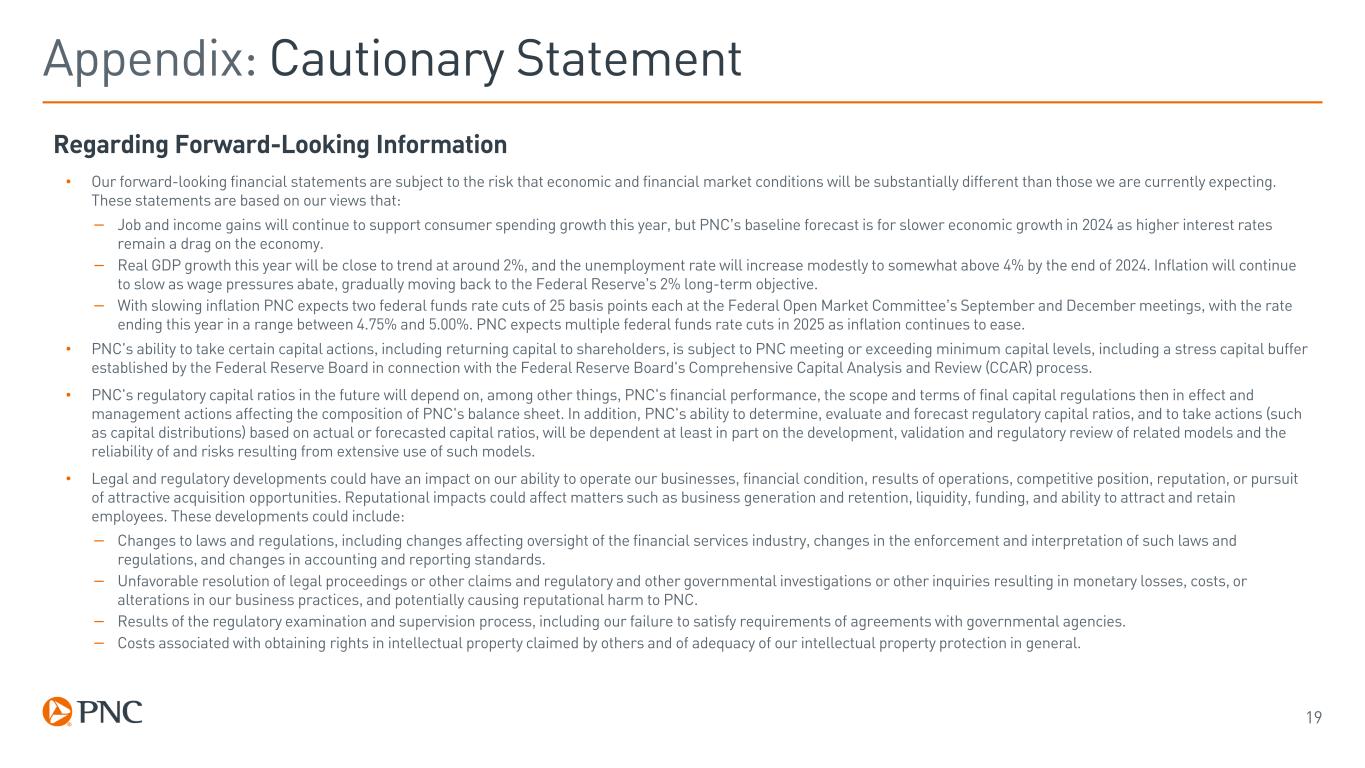 Appendix: Cautionary Statement 19 Regarding Forward-Looking Information • Our forward-looking financial statements are subject to the risk that economic and financial market conditions will be substantially different than those we are currently expecting. These statements are based on our views that: − Job and income gains will continue to support consumer spending growth this year, but PNC’s baseline forecast is for slower economic growth in 2024 as higher interest rates remain a drag on the economy. − Real GDP growth this year will be close to trend at around 2%, and the unemployment rate will increase modestly to somewhat above 4% by the end of 2024. Inflation will continue to slow as wage pressures abate, gradually moving back to the Federal Reserve’s 2% long-term objective. − With slowing inflation PNC expects two federal funds rate cuts of 25 basis points each at the Federal Open Market Committee’s September and December meetings, with the rate ending this year in a range between 4.75% and 5.00%. PNC expects multiple federal funds rate cuts in 2025 as inflation continues to ease. • PNC's ability to take certain capital actions, including returning capital to shareholders, is subject to PNC meeting or exceeding minimum capital levels, including a stress capital buffer established by the Federal Reserve Board in connection with the Federal Reserve Board's Comprehensive Capital Analysis and Review (CCAR) process. • PNC's regulatory capital ratios in the future will depend on, among other things, PNC's financial performance, the scope and terms of final capital regulations then in effect and management actions affecting the composition of PNC's balance sheet. In addition, PNC's ability to determine, evaluate and forecast regulatory capital ratios, and to take actions (such as capital distributions) based on actual or forecasted capital ratios, will be dependent at least in part on the development, validation and regulatory review of related models and the reliability of and risks resulting from extensive use of such models. • Legal and regulatory developments could have an impact on our ability to operate our businesses, financial condition, results of operations, competitive position, reputation, or pursuit of attractive acquisition opportunities. Reputational impacts could affect matters such as business generation and retention, liquidity, funding, and ability to attract and retain employees. These developments could include: − Changes to laws and regulations, including changes affecting oversight of the financial services industry, changes in the enforcement and interpretation of such laws and regulations, and changes in accounting and reporting standards. − Unfavorable resolution of legal proceedings or other claims and regulatory and other governmental investigations or other inquiries resulting in monetary losses, costs, or alterations in our business practices, and potentially causing reputational harm to PNC. − Results of the regulatory examination and supervision process, including our failure to satisfy requirements of agreements with governmental agencies. − Costs associated with obtaining rights in intellectual property claimed by others and of adequacy of our intellectual property protection in general.