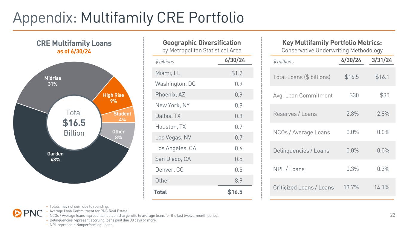Appendix: CRE Portfolio Represents 11% of Total Loans 21 Commercial Real Estate 11.0% Total $321.4 Billion Total Loans as of 6/30/24 PNC’s Commercial Real Estate (CRE) Portfolio $ billions 6/30/24 % of Total Loans Multifamily $16.5 5.1% Office 7.5 2.3% Industrial / Warehouse 4.1 1.3% Retail 2.2 0.7% Seniors Housing 1.9 0.6% Hotel / Motel 1.7 0.5% Mixed Use 0.4 0.1% Other 1.2 0.4% Total $35.5 11.0% – Totals may not sum due to rounding.