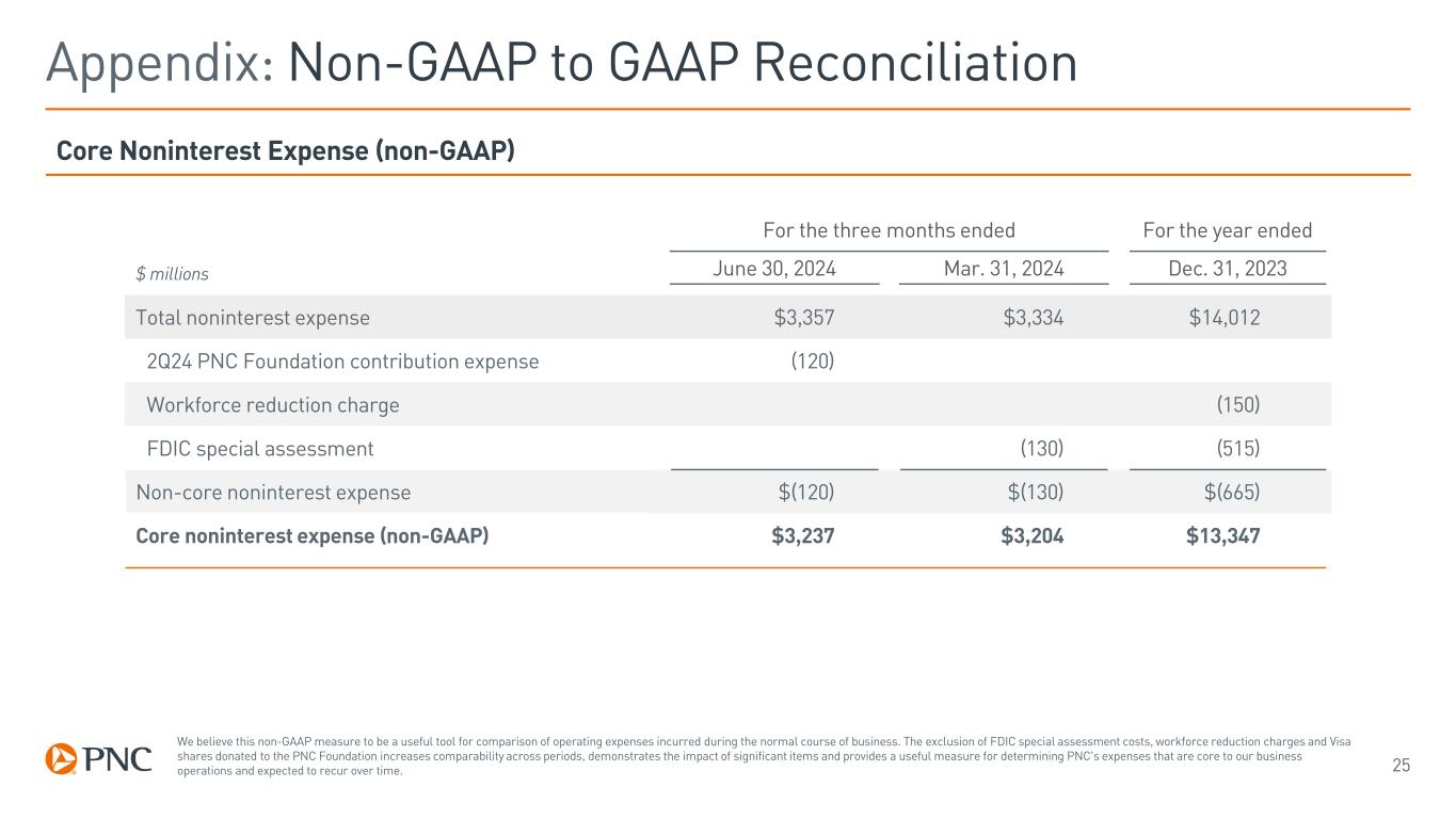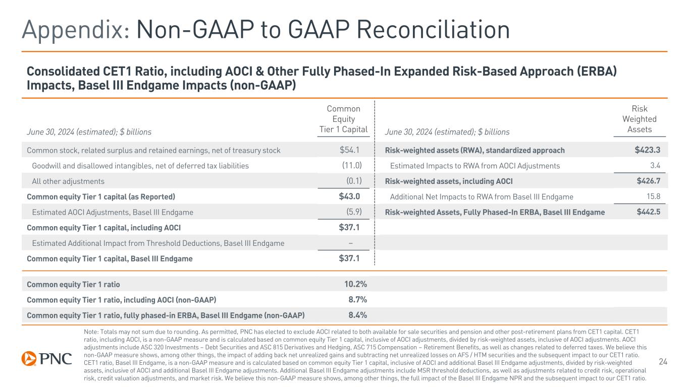 Appendix: Non-GAAP to GAAP Reconciliation 24 June 30, 2024 (estimated); $ billions Common Equity Tier 1 Capital June 30, 2024 (estimated); $ billions Risk Weighted Assets Common stock, related surplus and retained earnings, net of treasury stock $54.1 Risk-weighted assets (RWA), standardized approach $423.3 Goodwill and disallowed intangibles, net of deferred tax liabilities (11.0) Estimated Impacts to RWA from AOCI Adjustments 3.4 All other adjustments (0.1) Risk-weighted assets, including AOCI $426.7 Common equity Tier 1 capital (as Reported) $43.0 Additional Net Impacts to RWA from Basel III Endgame 15.8 Estimated AOCI Adjustments, Basel III Endgame (5.9) Risk-weighted Assets, Fully Phased-In ERBA, Basel III Endgame $442.5 Common equity Tier 1 capital, including AOCI $37.1 Estimated Additional Impact from Threshold Deductions, Basel III Endgame – Common equity Tier 1 capital, Basel III Endgame $37.1 Common equity Tier 1 ratio 10.2% Common equity Tier 1 ratio, including AOCI (non-GAAP) 8.7% Common equity Tier 1 ratio, fully phased-in ERBA, Basel III Endgame (non-GAAP) 8.4% Note: Totals may not sum due to rounding. As permitted, PNC has elected to exclude AOCI related to both available for sale securities and pension and other post-retirement plans from CET1 capital. CET1 ratio, including AOCI, is a non-GAAP measure and is calculated based on common equity Tier 1 capital, inclusive of AOCI adjustments, divided by risk-weighted assets, inclusive of AOCI adjustments. AOCI adjustments include ASC 320 Investments – Debt Securities and ASC 815 Derivatives and Hedging, ASC 715 Compensation – Retirement Benefits, as well as changes related to deferred taxes. We believe this non-GAAP measure shows, among other things, the impact of adding back net unrealized gains and subtracting net unrealized losses on AFS / HTM securities and the subsequent impact to our CET1 ratio. CET1 ratio, Basel III Endgame, is a non-GAAP measure and is calculated based on common equity Tier 1 capital, inclusive of AOCI and additional Basel III Endgame adjustments, divided by risk-weighted assets, inclusive of AOCI and additional Basel III Endgame adjustments. Additional Basel III Endgame adjustments include MSR threshold deductions, as well as adjustments related to credit risk, operational risk, credit valuation adjustments, and market risk. We believe this non-GAAP measure shows, among other things, the full impact of the Basel III Endgame NPR and the subsequent impact to our CET1 ratio. Consolidated CET1 Ratio, including AOCI & Other Fully Phased-In Expanded Risk-Based Approach (ERBA) Impacts, Basel III Endgame Impacts (non-GAAP)