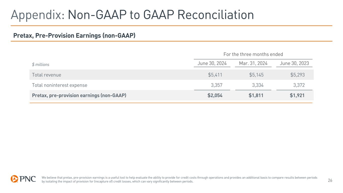 Appendix: Non-GAAP to GAAP Reconciliation 25 We believe this non-GAAP measure to be a useful tool for comparison of operating expenses incurred during the normal course of business. The exclusion of FDIC special assessment costs, workforce reduction charges and Visa shares donated to the PNC Foundation increases comparability across periods, demonstrates the impact of significant items and provides a useful measure for determining PNC’s expenses that are core to our business operations and expected to recur over time. Core Noninterest Expense (non-GAAP) For the three months ended For the year ended $ millions June 30, 2024 Mar. 31, 2024 Dec. 31, 2023 Total noninterest expense $3,357 $3,334 $14,012 2Q24 PNC Foundation contribution expense (120) Workforce reduction charge (150) FDIC special assessment (130) (515) Non-core noninterest expense $(120) $(130) $(665) Core noninterest expense (non-GAAP) $3,237 $3,204 $13,347