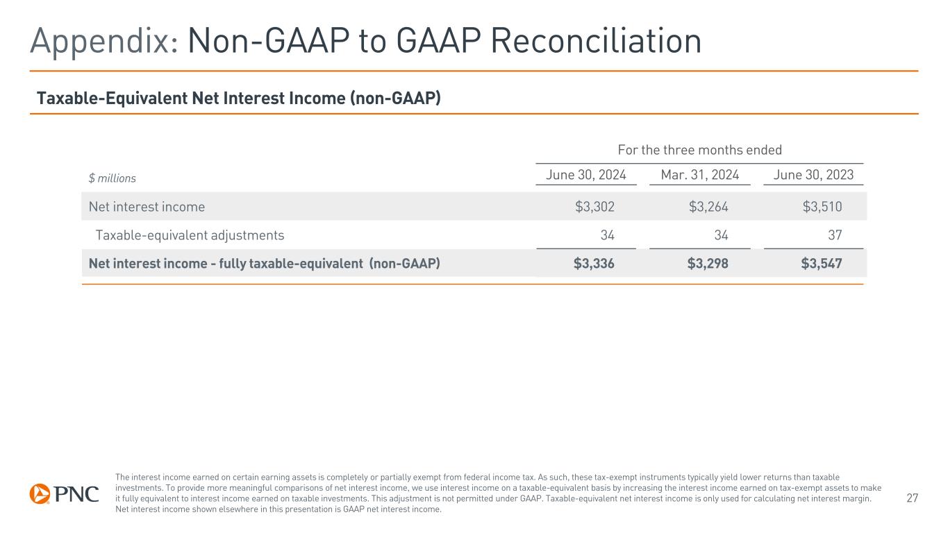 Appendix: Non-GAAP to GAAP Reconciliation 26 We believe that pretax, pre-provision earnings is a useful tool to help evaluate the ability to provide for credit costs through operations and provides an additional basis to compare results between periods by isolating the impact of provision for (recapture of) credit losses, which can vary significantly between periods. For the three months ended $ millions June 30, 2024 Mar. 31, 2024 June 30, 2023 Total revenue $5,411 $5,145 $5,293 Total noninterest expense 3,357 3,334 3,372 Pretax, pre-provision earnings (non-GAAP) $2,054 $1,811 $1,921 Pretax, Pre-Provision Earnings (non-GAAP)
