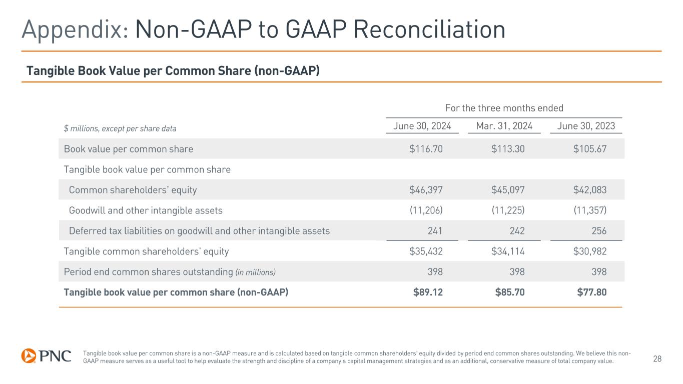 Appendix: Non-GAAP to GAAP Reconciliation 27 The interest income earned on certain earning assets is completely or partially exempt from federal income tax. As such, these tax-exempt instruments typically yield lower returns than taxable investments. To provide more meaningful comparisons of net interest income, we use interest income on a taxable-equivalent basis by increasing the interest income earned on tax-exempt assets to make it fully equivalent to interest income earned on taxable investments. This adjustment is not permitted under GAAP. Taxable-equivalent net interest income is only used for calculating net interest margin. Net interest income shown elsewhere in this presentation is GAAP net interest income. For the three months ended $ millions June 30, 2024 Mar. 31, 2024 June 30, 2023 Net interest income $3,302 $3,264 $3,510 Taxable-equivalent adjustments 34 34 37 Net interest income - fully taxable-equivalent (non-GAAP) $3,336 $3,298 $3,547 Taxable-Equivalent Net Interest Income (non-GAAP)
