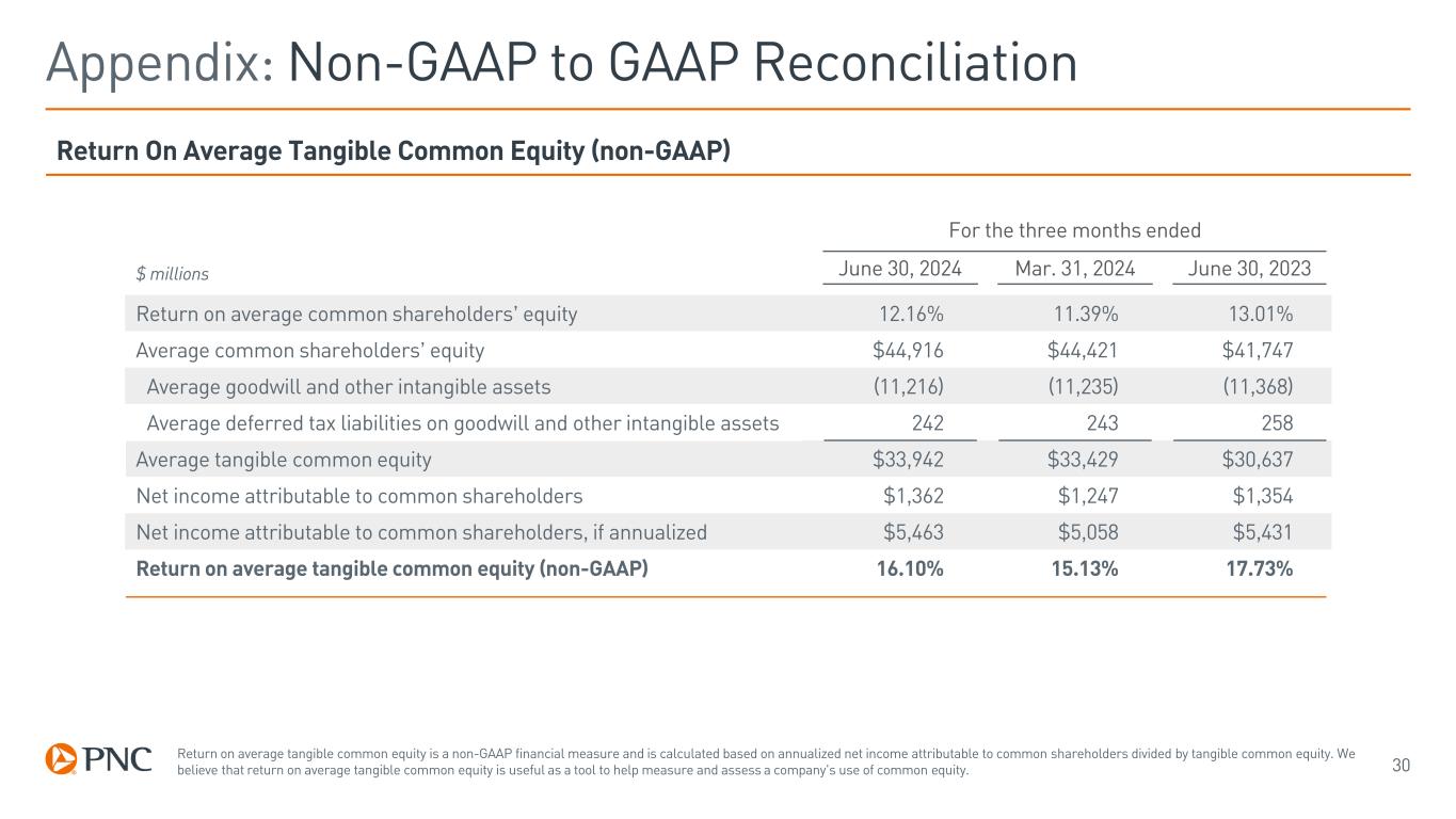 Appendix: Non-GAAP to GAAP Reconciliation 29 Tangible common equity ratio is a non-GAAP measure and is calculated based on tangible common shareholders’ equity divided by tangible assets. We believe this non-GAAP measure to be a key financial metric in assessing capital adequacy. For the three months ended $ millions June 30, 2024 Mar. 31, 2024 June 30, 2023 Tangible common shareholders’ equity Common shareholders’ equity $46,397 $45,097 $42,083 Goodwill and other intangible assets (11,206) (11,225) (11,357) Deferred tax liabilities on goodwill and other intangible assets 241 242 256 Tangible common shareholders' equity $35,432 $34,114 $30,982 Tangible assets Total assets $556,519 $566,162 $558,207 Goodwill and other intangible assets (11,206) (11,225) (11,357) Deferred tax liabilities on goodwill and other intangible assets 241 242 256 Tangible assets $545,554 $555,179 $547,106 Tangible common equity ratio (non-GAAP) 6.49% 6.14% 5.66% Tangible Common Equity Ratio (non-GAAP)