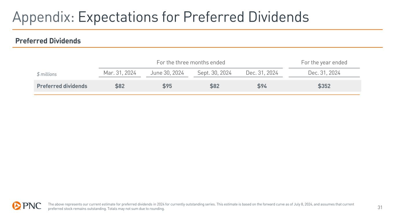 Appendix: Non-GAAP to GAAP Reconciliation 30 Return on average tangible common equity is a non-GAAP financial measure and is calculated based on annualized net income attributable to common shareholders divided by tangible common equity. We believe that return on average tangible common equity is useful as a tool to help measure and assess a company's use of common equity. For the three months ended $ millions June 30, 2024 Mar. 31, 2024 June 30, 2023 Return on average common shareholders’ equity 12.16% 11.39% 13.01% Average common shareholders’ equity $44,916 $44,421 $41,747 Average goodwill and other intangible assets (11,216) (11,235) (11,368) Average deferred tax liabilities on goodwill and other intangible assets 242 243 258 Average tangible common equity $33,942 $33,429 $30,637 Net income attributable to common shareholders $1,362 $1,247 $1,354 Net income attributable to common shareholders, if annualized $5,463 $5,058 $5,431 Return on average tangible common equity (non-GAAP) 16.10% 15.13% 17.73% Return On Average Tangible Common Equity (non-GAAP)
