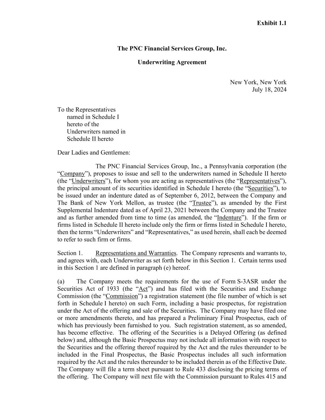 Exhibit 1.1 The PNC Financial Services Group, Inc. Underwriting Agreement New York, New York July 18, 2024 To the Representatives named in Schedule I hereto of the Underwriters named in Schedule II hereto Dear Ladies and Gentlemen: The PNC Financial Services Group, Inc., a Pennsylvania corporation (the “Company”), proposes to issue and sell to the underwriters named in Schedule II hereto (the “Underwriters”), for whom you are acting as representatives (the “Representatives”), the principal amount of its securities identified in Schedule I hereto (the “Securities”), to be issued under an indenture dated as of September 6, 2012, between the Company and The Bank of New York Mellon, as trustee (the “Trustee”), as amended by the First Supplemental Indenture dated as of April 23, 2021 between the Company and the Trustee and as further amended from time to time (as amended, the “Indenture”). If the firm or firms listed in Schedule II hereto include only the firm or firms listed in Schedule I hereto, then the terms “Underwriters” and “Representatives,” as used herein, shall each be deemed to refer to such firm or firms. Section 1. Representations and Warranties. The Company represents and warrants to, and agrees with, each Underwriter as set forth below in this Section 1. Certain terms used in this Section 1 are defined in paragraph (e) hereof. (a) The Company meets the requirements for the use of Form S-3ASR under the Securities Act of 1933 (the “Act”) and has filed with the Securities and Exchange Commission (the “Commission”) a registration statement (the file number of which is set forth in Schedule I hereto) on such Form, including a basic prospectus, for registration under the Act of the offering and sale of the Securities. The Company may have filed one or more amendments thereto, and has prepared a Preliminary Final Prospectus, each of which has previously been furnished to you. Such registration statement, as so amended, has become effective. The offering of the Securities is a Delayed Offering (as defined below) and, although the Basic Prospectus may not include all information with respect to the Securities and the offering thereof required by the Act and the rules thereunder to be included in the Final Prospectus, the Basic Prospectus includes all such information required by the Act and the rules thereunder to be included therein as of the Effective Date. The Company will file a term sheet pursuant to Rule 433 disclosing the pricing terms of the offering. The Company will next file with the Commission pursuant to Rules 415 and