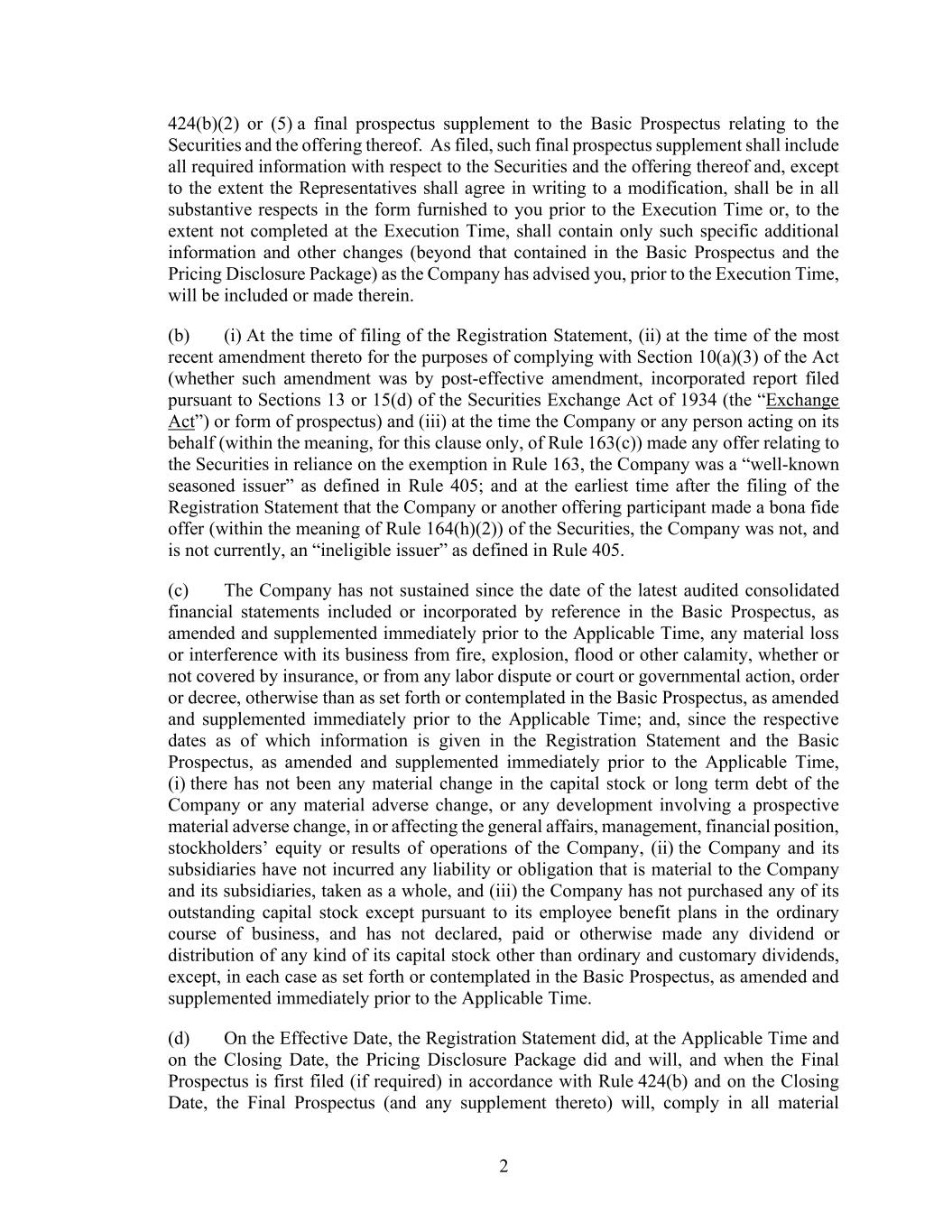 2 424(b)(2) or (5) a final prospectus supplement to the Basic Prospectus relating to the Securities and the offering thereof. As filed, such final prospectus supplement shall include all required information with respect to the Securities and the offering thereof and, except to the extent the Representatives shall agree in writing to a modification, shall be in all substantive respects in the form furnished to you prior to the Execution Time or, to the extent not completed at the Execution Time, shall contain only such specific additional information and other changes (beyond that contained in the Basic Prospectus and the Pricing Disclosure Package) as the Company has advised you, prior to the Execution Time, will be included or made therein. (b) (i) At the time of filing of the Registration Statement, (ii) at the time of the most recent amendment thereto for the purposes of complying with Section 10(a)(3) of the Act (whether such amendment was by post-effective amendment, incorporated report filed pursuant to Sections 13 or 15(d) of the Securities Exchange Act of 1934 (the “Exchange Act”) or form of prospectus) and (iii) at the time the Company or any person acting on its behalf (within the meaning, for this clause only, of Rule 163(c)) made any offer relating to the Securities in reliance on the exemption in Rule 163, the Company was a “well-known seasoned issuer” as defined in Rule 405; and at the earliest time after the filing of the Registration Statement that the Company or another offering participant made a bona fide offer (within the meaning of Rule 164(h)(2)) of the Securities, the Company was not, and is not currently, an “ineligible issuer” as defined in Rule 405. (c) The Company has not sustained since the date of the latest audited consolidated financial statements included or incorporated by reference in the Basic Prospectus, as amended and supplemented immediately prior to the Applicable Time, any material loss or interference with its business from fire, explosion, flood or other calamity, whether or not covered by insurance, or from any labor dispute or court or governmental action, order or decree, otherwise than as set forth or contemplated in the Basic Prospectus, as amended and supplemented immediately prior to the Applicable Time; and, since the respective dates as of which information is given in the Registration Statement and the Basic Prospectus, as amended and supplemented immediately prior to the Applicable Time, (i) there has not been any material change in the capital stock or long term debt of the Company or any material adverse change, or any development involving a prospective material adverse change, in or affecting the general affairs, management, financial position, stockholders’ equity or results of operations of the Company, (ii) the Company and its subsidiaries have not incurred any liability or obligation that is material to the Company and its subsidiaries, taken as a whole, and (iii) the Company has not purchased any of its outstanding capital stock except pursuant to its employee benefit plans in the ordinary course of business, and has not declared, paid or otherwise made any dividend or distribution of any kind of its capital stock other than ordinary and customary dividends, except, in each case as set forth or contemplated in the Basic Prospectus, as amended and supplemented immediately prior to the Applicable Time. (d) On the Effective Date, the Registration Statement did, at the Applicable Time and on the Closing Date, the Pricing Disclosure Package did and will, and when the Final Prospectus is first filed (if required) in accordance with Rule 424(b) and on the Closing Date, the Final Prospectus (and any supplement thereto) will, comply in all material