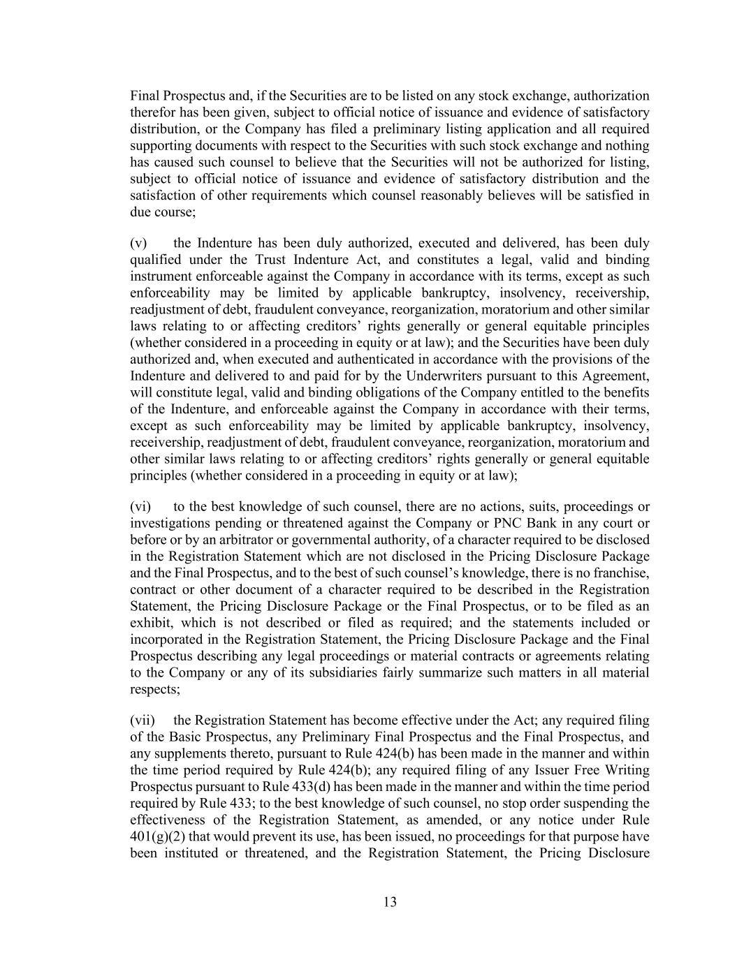 13 Final Prospectus and, if the Securities are to be listed on any stock exchange, authorization therefor has been given, subject to official notice of issuance and evidence of satisfactory distribution, or the Company has filed a preliminary listing application and all required supporting documents with respect to the Securities with such stock exchange and nothing has caused such counsel to believe that the Securities will not be authorized for listing, subject to official notice of issuance and evidence of satisfactory distribution and the satisfaction of other requirements which counsel reasonably believes will be satisfied in due course; (v) the Indenture has been duly authorized, executed and delivered, has been duly qualified under the Trust Indenture Act, and constitutes a legal, valid and binding instrument enforceable against the Company in accordance with its terms, except as such enforceability may be limited by applicable bankruptcy, insolvency, receivership, readjustment of debt, fraudulent conveyance, reorganization, moratorium and other similar laws relating to or affecting creditors’ rights generally or general equitable principles (whether considered in a proceeding in equity or at law); and the Securities have been duly authorized and, when executed and authenticated in accordance with the provisions of the Indenture and delivered to and paid for by the Underwriters pursuant to this Agreement, will constitute legal, valid and binding obligations of the Company entitled to the benefits of the Indenture, and enforceable against the Company in accordance with their terms, except as such enforceability may be limited by applicable bankruptcy, insolvency, receivership, readjustment of debt, fraudulent conveyance, reorganization, moratorium and other similar laws relating to or affecting creditors’ rights generally or general equitable principles (whether considered in a proceeding in equity or at law); (vi) to the best knowledge of such counsel, there are no actions, suits, proceedings or investigations pending or threatened against the Company or PNC Bank in any court or before or by an arbitrator or governmental authority, of a character required to be disclosed in the Registration Statement which are not disclosed in the Pricing Disclosure Package and the Final Prospectus, and to the best of such counsel’s knowledge, there is no franchise, contract or other document of a character required to be described in the Registration Statement, the Pricing Disclosure Package or the Final Prospectus, or to be filed as an exhibit, which is not described or filed as required; and the statements included or incorporated in the Registration Statement, the Pricing Disclosure Package and the Final Prospectus describing any legal proceedings or material contracts or agreements relating to the Company or any of its subsidiaries fairly summarize such matters in all material respects; (vii) the Registration Statement has become effective under the Act; any required filing of the Basic Prospectus, any Preliminary Final Prospectus and the Final Prospectus, and any supplements thereto, pursuant to Rule 424(b) has been made in the manner and within the time period required by Rule 424(b); any required filing of any Issuer Free Writing Prospectus pursuant to Rule 433(d) has been made in the manner and within the time period required by Rule 433; to the best knowledge of such counsel, no stop order suspending the effectiveness of the Registration Statement, as amended, or any notice under Rule 401(g)(2) that would prevent its use, has been issued, no proceedings for that purpose have been instituted or threatened, and the Registration Statement, the Pricing Disclosure