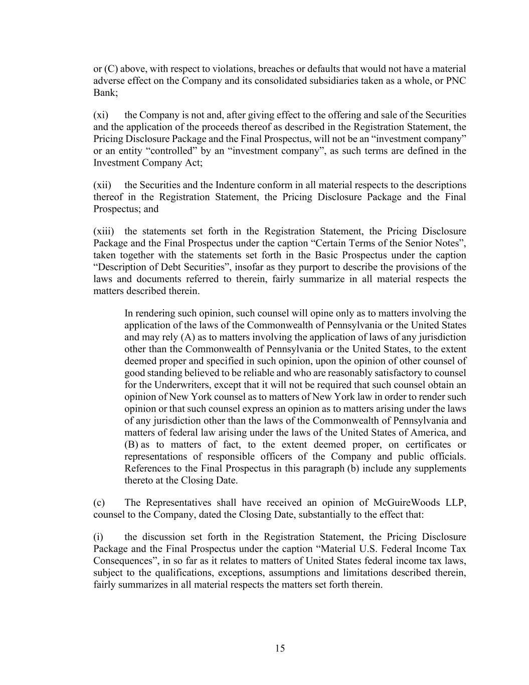 15 or (C) above, with respect to violations, breaches or defaults that would not have a material adverse effect on the Company and its consolidated subsidiaries taken as a whole, or PNC Bank; (xi) the Company is not and, after giving effect to the offering and sale of the Securities and the application of the proceeds thereof as described in the Registration Statement, the Pricing Disclosure Package and the Final Prospectus, will not be an “investment company” or an entity “controlled” by an “investment company”, as such terms are defined in the Investment Company Act; (xii) the Securities and the Indenture conform in all material respects to the descriptions thereof in the Registration Statement, the Pricing Disclosure Package and the Final Prospectus; and (xiii) the statements set forth in the Registration Statement, the Pricing Disclosure Package and the Final Prospectus under the caption “Certain Terms of the Senior Notes”, taken together with the statements set forth in the Basic Prospectus under the caption “Description of Debt Securities”, insofar as they purport to describe the provisions of the laws and documents referred to therein, fairly summarize in all material respects the matters described therein. In rendering such opinion, such counsel will opine only as to matters involving the application of the laws of the Commonwealth of Pennsylvania or the United States and may rely (A) as to matters involving the application of laws of any jurisdiction other than the Commonwealth of Pennsylvania or the United States, to the extent deemed proper and specified in such opinion, upon the opinion of other counsel of good standing believed to be reliable and who are reasonably satisfactory to counsel for the Underwriters, except that it will not be required that such counsel obtain an opinion of New York counsel as to matters of New York law in order to render such opinion or that such counsel express an opinion as to matters arising under the laws of any jurisdiction other than the laws of the Commonwealth of Pennsylvania and matters of federal law arising under the laws of the United States of America, and (B) as to matters of fact, to the extent deemed proper, on certificates or representations of responsible officers of the Company and public officials. References to the Final Prospectus in this paragraph (b) include any supplements thereto at the Closing Date. (c) The Representatives shall have received an opinion of McGuireWoods LLP, counsel to the Company, dated the Closing Date, substantially to the effect that: (i) the discussion set forth in the Registration Statement, the Pricing Disclosure Package and the Final Prospectus under the caption “Material U.S. Federal Income Tax Consequences”, in so far as it relates to matters of United States federal income tax laws, subject to the qualifications, exceptions, assumptions and limitations described therein, fairly summarizes in all material respects the matters set forth therein.