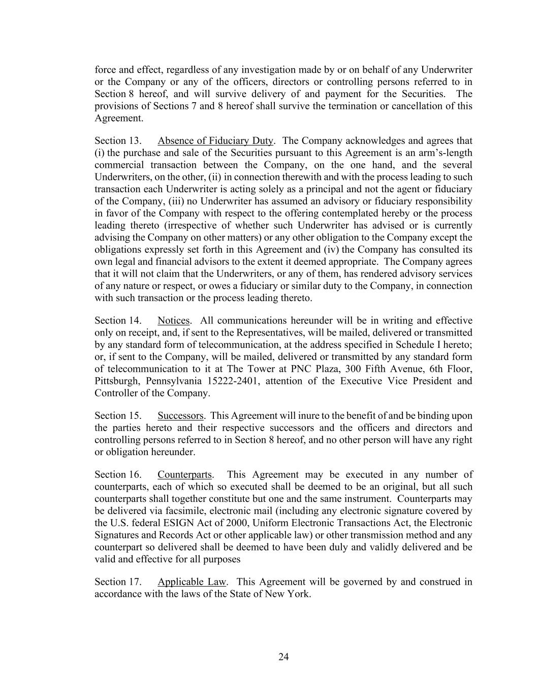 24 force and effect, regardless of any investigation made by or on behalf of any Underwriter or the Company or any of the officers, directors or controlling persons referred to in Section 8 hereof, and will survive delivery of and payment for the Securities. The provisions of Sections 7 and 8 hereof shall survive the termination or cancellation of this Agreement. Section 13. Absence of Fiduciary Duty. The Company acknowledges and agrees that (i) the purchase and sale of the Securities pursuant to this Agreement is an arm’s-length commercial transaction between the Company, on the one hand, and the several Underwriters, on the other, (ii) in connection therewith and with the process leading to such transaction each Underwriter is acting solely as a principal and not the agent or fiduciary of the Company, (iii) no Underwriter has assumed an advisory or fiduciary responsibility in favor of the Company with respect to the offering contemplated hereby or the process leading thereto (irrespective of whether such Underwriter has advised or is currently advising the Company on other matters) or any other obligation to the Company except the obligations expressly set forth in this Agreement and (iv) the Company has consulted its own legal and financial advisors to the extent it deemed appropriate. The Company agrees that it will not claim that the Underwriters, or any of them, has rendered advisory services of any nature or respect, or owes a fiduciary or similar duty to the Company, in connection with such transaction or the process leading thereto. Section 14. Notices. All communications hereunder will be in writing and effective only on receipt, and, if sent to the Representatives, will be mailed, delivered or transmitted by any standard form of telecommunication, at the address specified in Schedule I hereto; or, if sent to the Company, will be mailed, delivered or transmitted by any standard form of telecommunication to it at The Tower at PNC Plaza, 300 Fifth Avenue, 6th Floor, Pittsburgh, Pennsylvania 15222-2401, attention of the Executive Vice President and Controller of the Company. Section 15. Successors. This Agreement will inure to the benefit of and be binding upon the parties hereto and their respective successors and the officers and directors and controlling persons referred to in Section 8 hereof, and no other person will have any right or obligation hereunder. Section 16. Counterparts. This Agreement may be executed in any number of counterparts, each of which so executed shall be deemed to be an original, but all such counterparts shall together constitute but one and the same instrument. Counterparts may be delivered via facsimile, electronic mail (including any electronic signature covered by the U.S. federal ESIGN Act of 2000, Uniform Electronic Transactions Act, the Electronic Signatures and Records Act or other applicable law) or other transmission method and any counterpart so delivered shall be deemed to have been duly and validly delivered and be valid and effective for all purposes Section 17. Applicable Law. This Agreement will be governed by and construed in accordance with the laws of the State of New York.