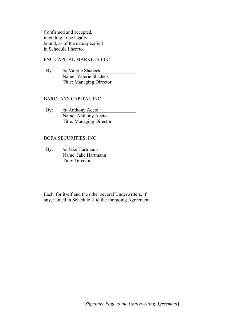 [Signature Page to the Underwriting Agreement] Confirmed and accepted, intending to be legally bound, as of the date specified in Schedule I hereto. PNC CAPITAL MARKETS LLC By: /s/ Valerie Shadeck Name: Valerie Shadeck Title: Managing Director BARCLAYS CAPITAL INC. By: /s/ Anthony Aceto Name: Anthony Aceto Title: Managing Director BOFA SECURITIES, INC By: /s/ Jake Hartmann Name: Jake Hartmann Title: Director Each, for itself and the other several Underwriters, if any, named in Schedule II to the foregoing Agreement