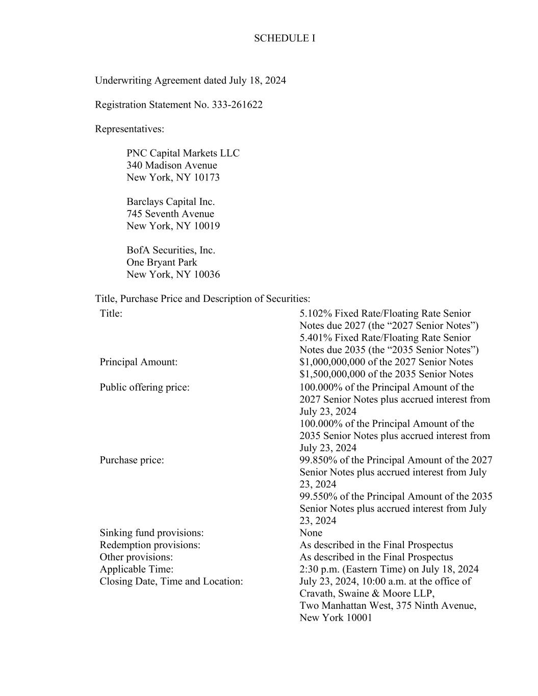 SCHEDULE I Underwriting Agreement dated July 18, 2024 Registration Statement No. 333-261622 Representatives: PNC Capital Markets LLC 340 Madison Avenue New York, NY 10173 Barclays Capital Inc. 745 Seventh Avenue New York, NY 10019 BofA Securities, Inc. One Bryant Park New York, NY 10036 Title, Purchase Price and Description of Securities: Title: 5.102% Fixed Rate/Floating Rate Senior Notes due 2027 (the “2027 Senior Notes”) 5.401% Fixed Rate/Floating Rate Senior Notes due 2035 (the “2035 Senior Notes”) Principal Amount: $1,000,000,000 of the 2027 Senior Notes $1,500,000,000 of the 2035 Senior Notes Public offering price: 100.000% of the Principal Amount of the 2027 Senior Notes plus accrued interest from July 23, 2024 100.000% of the Principal Amount of the 2035 Senior Notes plus accrued interest from July 23, 2024 Purchase price: 99.850% of the Principal Amount of the 2027 Senior Notes plus accrued interest from July 23, 2024 99.550% of the Principal Amount of the 2035 Senior Notes plus accrued interest from July 23, 2024 Sinking fund provisions: None Redemption provisions: As described in the Final Prospectus Other provisions: As described in the Final Prospectus Applicable Time: 2:30 p.m. (Eastern Time) on July 18, 2024 Closing Date, Time and Location: July 23, 2024, 10:00 a.m. at the office of Cravath, Swaine & Moore LLP, Two Manhattan West, 375 Ninth Avenue, New York 10001