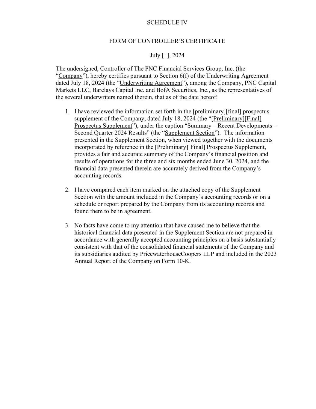 SCHEDULE IV FORM OF CONTROLLER’S CERTIFICATE July [ ], 2024 The undersigned, Controller of The PNC Financial Services Group, Inc. (the “Company”), hereby certifies pursuant to Section 6(f) of the Underwriting Agreement dated July 18, 2024 (the “Underwriting Agreement”), among the Company, PNC Capital Markets LLC, Barclays Capital Inc. and BofA Securities, Inc., as the representatives of the several underwriters named therein, that as of the date hereof: 1. I have reviewed the information set forth in the [preliminary][final] prospectus supplement of the Company, dated July 18, 2024 (the “[Preliminary][Final] Prospectus Supplement”), under the caption “Summary – Recent Developments – Second Quarter 2024 Results” (the “Supplement Section”). The information presented in the Supplement Section, when viewed together with the documents incorporated by reference in the [Preliminary][Final] Prospectus Supplement, provides a fair and accurate summary of the Company’s financial position and results of operations for the three and six months ended June 30, 2024, and the financial data presented therein are accurately derived from the Company’s accounting records. 2. I have compared each item marked on the attached copy of the Supplement Section with the amount included in the Company’s accounting records or on a schedule or report prepared by the Company from its accounting records and found them to be in agreement. 3. No facts have come to my attention that have caused me to believe that the historical financial data presented in the Supplement Section are not prepared in accordance with generally accepted accounting principles on a basis substantially consistent with that of the consolidated financial statements of the Company and its subsidiaries audited by PricewaterhouseCoopers LLP and included in the 2023 Annual Report of the Company on Form 10-K.
