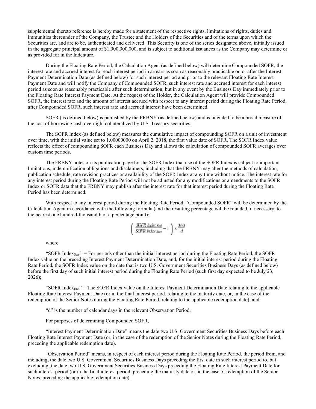 supplemental thereto reference is hereby made for a statement of the respective rights, limitations of rights, duties and immunities thereunder of the Company, the Trustee and the Holders of the Securities and of the terms upon which the Securities are, and are to be, authenticated and delivered. This Security is one of the series designated above, initially issued in the aggregate principal amount of $1,000,000,000, and is subject to additional issuances as the Company may determine or as provided for in the Indenture. During the Floating Rate Period, the Calculation Agent (as defined below) will determine Compounded SOFR, the interest rate and accrued interest for each interest period in arrears as soon as reasonably practicable on or after the Interest Payment Determination Date (as defined below) for such interest period and prior to the relevant Floating Rate Interest Payment Date and will notify the Company of Compounded SOFR, such interest rate and accrued interest for each interest period as soon as reasonably practicable after such determination, but in any event by the Business Day immediately prior to the Floating Rate Interest Payment Date. At the request of the Holder, the Calculation Agent will provide Compounded SOFR, the interest rate and the amount of interest accrued with respect to any interest period during the Floating Rate Period, after Compounded SOFR, such interest rate and accrued interest have been determined. SOFR (as defined below) is published by the FRBNY (as defined below) and is intended to be a broad measure of the cost of borrowing cash overnight collateralized by U.S. Treasury securities. The SOFR Index (as defined below) measures the cumulative impact of compounding SOFR on a unit of investment over time, with the initial value set to 1.00000000 on April 2, 2018, the first value date of SOFR. The SOFR Index value reflects the effect of compounding SOFR each Business Day and allows the calculation of compounded SOFR averages over custom time periods. The FRBNY notes on its publication page for the SOFR Index that use of the SOFR Index is subject to important limitations, indemnification obligations and disclaimers, including that the FRBNY may alter the methods of calculation, publication schedule, rate revision practices or availability of the SOFR Index at any time without notice. The interest rate for any interest period during the Floating Rate Period will not be adjusted for any modifications or amendments to the SOFR Index or SOFR data that the FRBNY may publish after the interest rate for that interest period during the Floating Rate Period has been determined. With respect to any interest period during the Floating Rate Period, “Compounded SOFR” will be determined by the Calculation Agent in accordance with the following formula (and the resulting percentage will be rounded, if necessary, to the nearest one hundred-thousandth of a percentage point): where: “SOFR IndexStart” = For periods other than the initial interest period during the Floating Rate Period, the SOFR Index value on the preceding Interest Payment Determination Date, and, for the initial interest period during the Floating Rate Period, the SOFR Index value on the date that is two U.S. Government Securities Business Days (as defined below) before the first day of such initial interest period during the Floating Rate Period (such first day expected to be July 23, 2026); “SOFR IndexEnd” = The SOFR Index value on the Interest Payment Determination Date relating to the applicable Floating Rate Interest Payment Date (or in the final interest period, relating to the maturity date, or, in the case of the redemption of the Senior Notes during the Floating Rate Period, relating to the applicable redemption date); and “d” is the number of calendar days in the relevant Observation Period. For purposes of determining Compounded SOFR, “Interest Payment Determination Date” means the date two U.S. Government Securities Business Days before each Floating Rate Interest Payment Date (or, in the case of the redemption of the Senior Notes during the Floating Rate Period, preceding the applicable redemption date). “Observation Period” means, in respect of each interest period during the Floating Rate Period, the period from, and including, the date two U.S. Government Securities Business Days preceding the first date in such interest period to, but excluding, the date two U.S. Government Securities Business Days preceding the Floating Rate Interest Payment Date for such interest period (or in the final interest period, preceding the maturity date or, in the case of redemption of the Senior Notes, preceding the applicable redemption date).