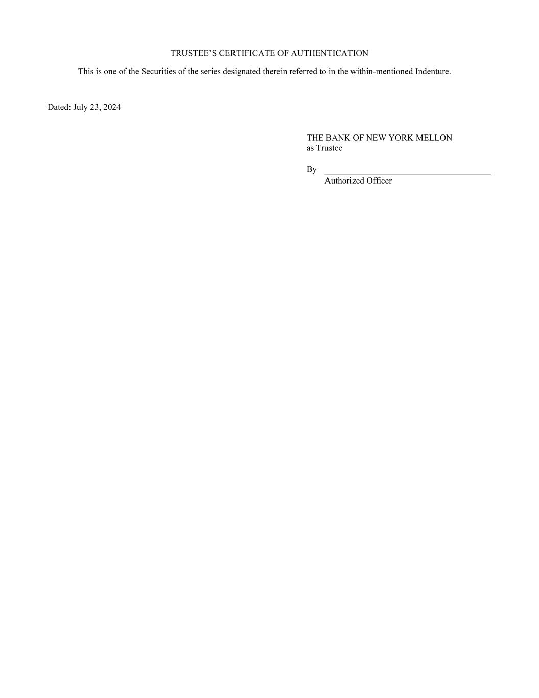 TRUSTEE’S CERTIFICATE OF AUTHENTICATION This is one of the Securities of the series designated therein referred to in the within-mentioned Indenture. Dated: July 23, 2024 THE BANK OF NEW YORK MELLON as Trustee By Authorized Officer