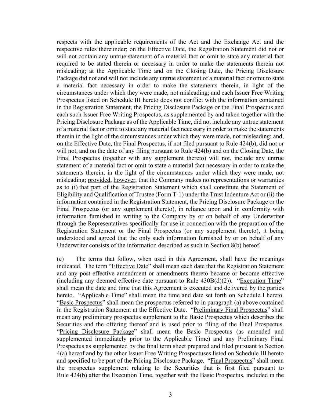3 respects with the applicable requirements of the Act and the Exchange Act and the respective rules thereunder; on the Effective Date, the Registration Statement did not or will not contain any untrue statement of a material fact or omit to state any material fact required to be stated therein or necessary in order to make the statements therein not misleading; at the Applicable Time and on the Closing Date, the Pricing Disclosure Package did not and will not include any untrue statement of a material fact or omit to state a material fact necessary in order to make the statements therein, in light of the circumstances under which they were made, not misleading; and each Issuer Free Writing Prospectus listed on Schedule III hereto does not conflict with the information contained in the Registration Statement, the Pricing Disclosure Package or the Final Prospectus and each such Issuer Free Writing Prospectus, as supplemented by and taken together with the Pricing Disclosure Package as of the Applicable Time, did not include any untrue statement of a material fact or omit to state any material fact necessary in order to make the statements therein in the light of the circumstances under which they were made, not misleading; and, on the Effective Date, the Final Prospectus, if not filed pursuant to Rule 424(b), did not or will not, and on the date of any filing pursuant to Rule 424(b) and on the Closing Date, the Final Prospectus (together with any supplement thereto) will not, include any untrue statement of a material fact or omit to state a material fact necessary in order to make the statements therein, in the light of the circumstances under which they were made, not misleading; provided, however, that the Company makes no representations or warranties as to (i) that part of the Registration Statement which shall constitute the Statement of Eligibility and Qualification of Trustee (Form T-1) under the Trust Indenture Act or (ii) the information contained in the Registration Statement, the Pricing Disclosure Package or the Final Prospectus (or any supplement thereto), in reliance upon and in conformity with information furnished in writing to the Company by or on behalf of any Underwriter through the Representatives specifically for use in connection with the preparation of the Registration Statement or the Final Prospectus (or any supplement thereto), it being understood and agreed that the only such information furnished by or on behalf of any Underwriter consists of the information described as such in Section 8(b) hereof. (e) The terms that follow, when used in this Agreement, shall have the meanings indicated. The term “Effective Date” shall mean each date that the Registration Statement and any post-effective amendment or amendments thereto became or become effective (including any deemed effective date pursuant to Rule 430B(d)(2)). “Execution Time” shall mean the date and time that this Agreement is executed and delivered by the parties hereto. “Applicable Time” shall mean the time and date set forth on Schedule I hereto. “Basic Prospectus” shall mean the prospectus referred to in paragraph (a) above contained in the Registration Statement at the Effective Date. “Preliminary Final Prospectus” shall mean any preliminary prospectus supplement to the Basic Prospectus which describes the Securities and the offering thereof and is used prior to filing of the Final Prospectus. “Pricing Disclosure Package” shall mean the Basic Prospectus (as amended and supplemented immediately prior to the Applicable Time) and any Preliminary Final Prospectus as supplemented by the final term sheet prepared and filed pursuant to Section 4(a) hereof and by the other Issuer Free Writing Prospectuses listed on Schedule III hereto and specified to be part of the Pricing Disclosure Package. “Final Prospectus” shall mean the prospectus supplement relating to the Securities that is first filed pursuant to Rule 424(b) after the Execution Time, together with the Basic Prospectus, included in the