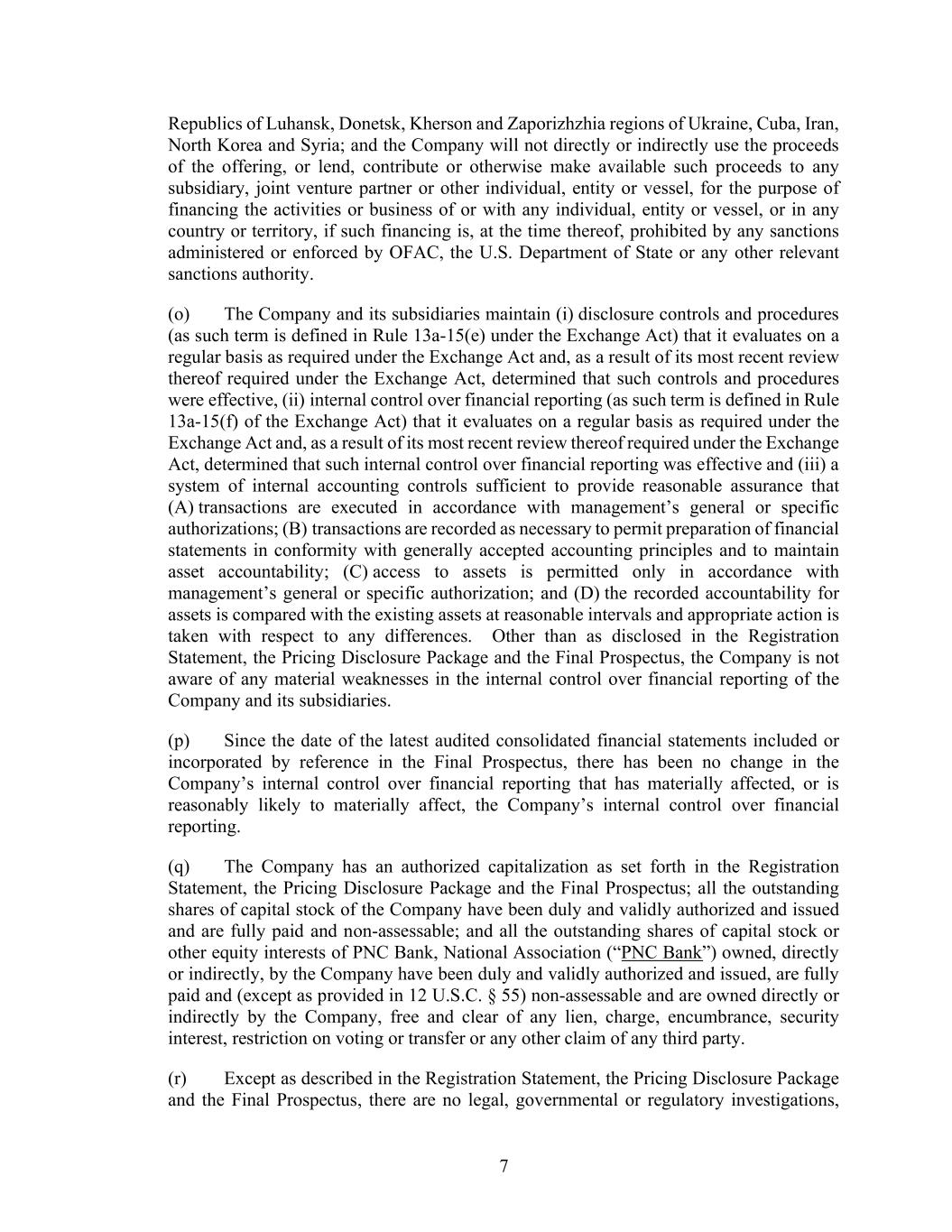 7 Republics of Luhansk, Donetsk, Kherson and Zaporizhzhia regions of Ukraine, Cuba, Iran, North Korea and Syria; and the Company will not directly or indirectly use the proceeds of the offering, or lend, contribute or otherwise make available such proceeds to any subsidiary, joint venture partner or other individual, entity or vessel, for the purpose of financing the activities or business of or with any individual, entity or vessel, or in any country or territory, if such financing is, at the time thereof, prohibited by any sanctions administered or enforced by OFAC, the U.S. Department of State or any other relevant sanctions authority. (o) The Company and its subsidiaries maintain (i) disclosure controls and procedures (as such term is defined in Rule 13a-15(e) under the Exchange Act) that it evaluates on a regular basis as required under the Exchange Act and, as a result of its most recent review thereof required under the Exchange Act, determined that such controls and procedures were effective, (ii) internal control over financial reporting (as such term is defined in Rule 13a-15(f) of the Exchange Act) that it evaluates on a regular basis as required under the Exchange Act and, as a result of its most recent review thereof required under the Exchange Act, determined that such internal control over financial reporting was effective and (iii) a system of internal accounting controls sufficient to provide reasonable assurance that (A) transactions are executed in accordance with management’s general or specific authorizations; (B) transactions are recorded as necessary to permit preparation of financial statements in conformity with generally accepted accounting principles and to maintain asset accountability; (C) access to assets is permitted only in accordance with management’s general or specific authorization; and (D) the recorded accountability for assets is compared with the existing assets at reasonable intervals and appropriate action is taken with respect to any differences. Other than as disclosed in the Registration Statement, the Pricing Disclosure Package and the Final Prospectus, the Company is not aware of any material weaknesses in the internal control over financial reporting of the Company and its subsidiaries. (p) Since the date of the latest audited consolidated financial statements included or incorporated by reference in the Final Prospectus, there has been no change in the Company’s internal control over financial reporting that has materially affected, or is reasonably likely to materially affect, the Company’s internal control over financial reporting. (q) The Company has an authorized capitalization as set forth in the Registration Statement, the Pricing Disclosure Package and the Final Prospectus; all the outstanding shares of capital stock of the Company have been duly and validly authorized and issued and are fully paid and non-assessable; and all the outstanding shares of capital stock or other equity interests of PNC Bank, National Association (“PNC Bank”) owned, directly or indirectly, by the Company have been duly and validly authorized and issued, are fully paid and (except as provided in 12 U.S.C. § 55) non-assessable and are owned directly or indirectly by the Company, free and clear of any lien, charge, encumbrance, security interest, restriction on voting or transfer or any other claim of any third party. (r) Except as described in the Registration Statement, the Pricing Disclosure Package and the Final Prospectus, there are no legal, governmental or regulatory investigations,