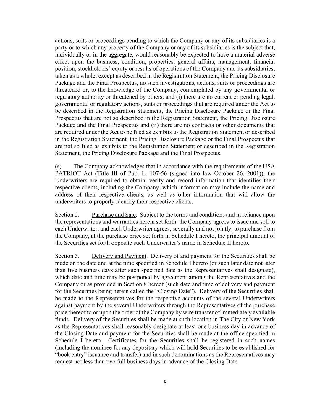 8 actions, suits or proceedings pending to which the Company or any of its subsidiaries is a party or to which any property of the Company or any of its subsidiaries is the subject that, individually or in the aggregate, would reasonably be expected to have a material adverse effect upon the business, condition, properties, general affairs, management, financial position, stockholders’ equity or results of operations of the Company and its subsidiaries, taken as a whole; except as described in the Registration Statement, the Pricing Disclosure Package and the Final Prospectus, no such investigations, actions, suits or proceedings are threatened or, to the knowledge of the Company, contemplated by any governmental or regulatory authority or threatened by others; and (i) there are no current or pending legal, governmental or regulatory actions, suits or proceedings that are required under the Act to be described in the Registration Statement, the Pricing Disclosure Package or the Final Prospectus that are not so described in the Registration Statement, the Pricing Disclosure Package and the Final Prospectus and (ii) there are no contracts or other documents that are required under the Act to be filed as exhibits to the Registration Statement or described in the Registration Statement, the Pricing Disclosure Package or the Final Prospectus that are not so filed as exhibits to the Registration Statement or described in the Registration Statement, the Pricing Disclosure Package and the Final Prospectus. (s) The Company acknowledges that in accordance with the requirements of the USA PATRIOT Act (Title III of Pub. L. 107-56 (signed into law October 26, 2001)), the Underwriters are required to obtain, verify and record information that identifies their respective clients, including the Company, which information may include the name and address of their respective clients, as well as other information that will allow the underwriters to properly identify their respective clients. Section 2. Purchase and Sale. Subject to the terms and conditions and in reliance upon the representations and warranties herein set forth, the Company agrees to issue and sell to each Underwriter, and each Underwriter agrees, severally and not jointly, to purchase from the Company, at the purchase price set forth in Schedule I hereto, the principal amount of the Securities set forth opposite such Underwriter’s name in Schedule II hereto. Section 3. Delivery and Payment. Delivery of and payment for the Securities shall be made on the date and at the time specified in Schedule I hereto (or such later date not later than five business days after such specified date as the Representatives shall designate), which date and time may be postponed by agreement among the Representatives and the Company or as provided in Section 8 hereof (such date and time of delivery and payment for the Securities being herein called the “Closing Date”). Delivery of the Securities shall be made to the Representatives for the respective accounts of the several Underwriters against payment by the several Underwriters through the Representatives of the purchase price thereof to or upon the order of the Company by wire transfer of immediately available funds. Delivery of the Securities shall be made at such location in The City of New York as the Representatives shall reasonably designate at least one business day in advance of the Closing Date and payment for the Securities shall be made at the office specified in Schedule I hereto. Certificates for the Securities shall be registered in such names (including the nominee for any depositary which will hold Securities to be established for “book entry” issuance and transfer) and in such denominations as the Representatives may request not less than two full business days in advance of the Closing Date.