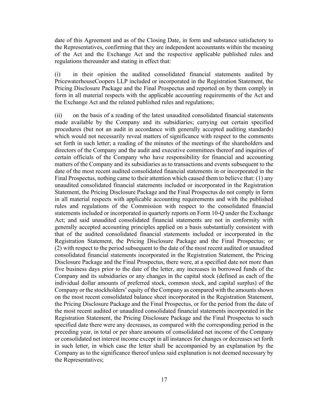 17 date of this Agreement and as of the Closing Date, in form and substance satisfactory to the Representatives, confirming that they are independent accountants within the meaning of the Act and the Exchange Act and the respective applicable published rules and regulations thereunder and stating in effect that: (i) in their opinion the audited consolidated financial statements audited by PricewaterhouseCoopers LLP included or incorporated in the Registration Statement, the Pricing Disclosure Package and the Final Prospectus and reported on by them comply in form in all material respects with the applicable accounting requirements of the Act and the Exchange Act and the related published rules and regulations; (ii) on the basis of a reading of the latest unaudited consolidated financial statements made available by the Company and its subsidiaries; carrying out certain specified procedures (but not an audit in accordance with generally accepted auditing standards) which would not necessarily reveal matters of significance with respect to the comments set forth in such letter; a reading of the minutes of the meetings of the shareholders and directors of the Company and the audit and executive committees thereof and inquiries of certain officials of the Company who have responsibility for financial and accounting matters of the Company and its subsidiaries as to transactions and events subsequent to the date of the most recent audited consolidated financial statements in or incorporated in the Final Prospectus, nothing came to their attention which caused them to believe that: (1) any unaudited consolidated financial statements included or incorporated in the Registration Statement, the Pricing Disclosure Package and the Final Prospectus do not comply in form in all material respects with applicable accounting requirements and with the published rules and regulations of the Commission with respect to the consolidated financial statements included or incorporated in quarterly reports on Form 10-Q under the Exchange Act; and said unaudited consolidated financial statements are not in conformity with generally accepted accounting principles applied on a basis substantially consistent with that of the audited consolidated financial statements included or incorporated in the Registration Statement, the Pricing Disclosure Package and the Final Prospectus; or (2) with respect to the period subsequent to the date of the most recent audited or unaudited consolidated financial statements incorporated in the Registration Statement, the Pricing Disclosure Package and the Final Prospectus, there were, at a specified date not more than five business days prior to the date of the letter, any increases in borrowed funds of the Company and its subsidiaries or any changes in the capital stock (defined as each of the individual dollar amounts of preferred stock, common stock, and capital surplus) of the Company or the stockholders’ equity of the Company as compared with the amounts shown on the most recent consolidated balance sheet incorporated in the Registration Statement, the Pricing Disclosure Package and the Final Prospectus, or for the period from the date of the most recent audited or unaudited consolidated financial statements incorporated in the Registration Statement, the Pricing Disclosure Package and the Final Prospectus to such specified date there were any decreases, as compared with the corresponding period in the preceding year, in total or per share amounts of consolidated net income of the Company or consolidated net interest income except in all instances for changes or decreases set forth in such letter, in which case the letter shall be accompanied by an explanation by the Company as to the significance thereof unless said explanation is not deemed necessary by the Representatives;