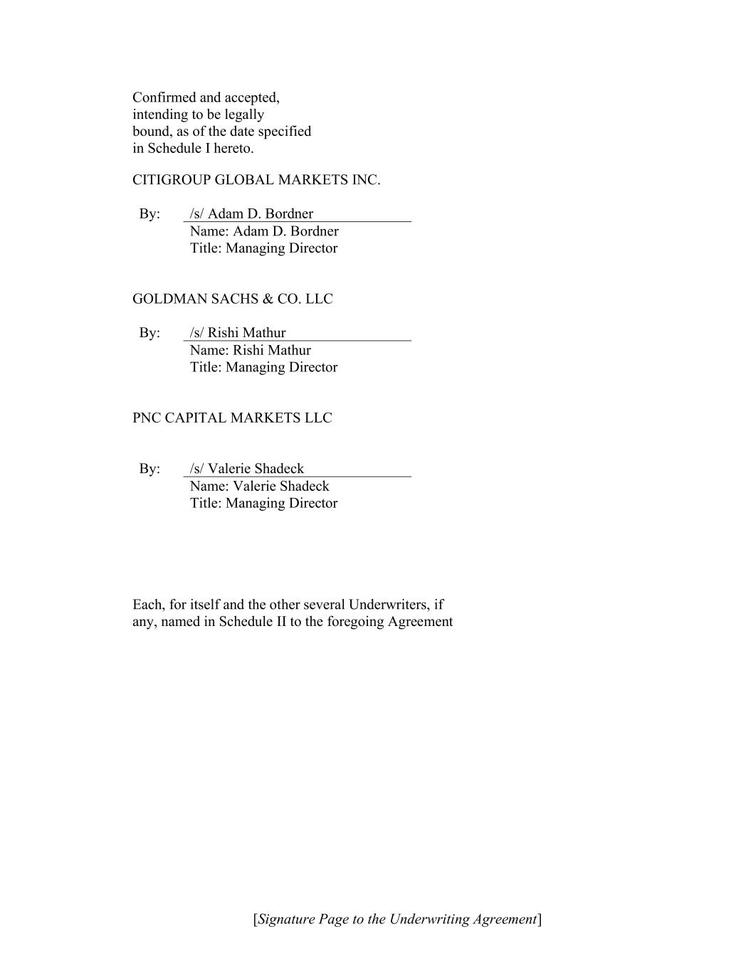 [Signature Page to the Underwriting Agreement] Confirmed and accepted, intending to be legally bound, as of the date specified in Schedule I hereto. CITIGROUP GLOBAL MARKETS INC. By: /s/ Adam D. Bordner Name: Adam D. Bordner Title: Managing Director GOLDMAN SACHS & CO. LLC By: /s/ Rishi Mathur Name: Rishi Mathur Title: Managing Director PNC CAPITAL MARKETS LLC By: /s/ Valerie Shadeck Name: Valerie Shadeck Title: Managing Director Each, for itself and the other several Underwriters, if any, named in Schedule II to the foregoing Agreement