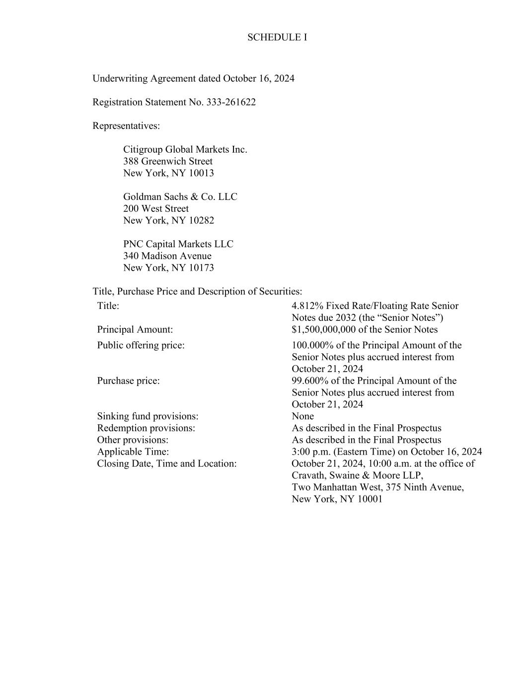 SCHEDULE I Underwriting Agreement dated October 16, 2024 Registration Statement No. 333-261622 Representatives: Citigroup Global Markets Inc. 388 Greenwich Street New York, NY 10013 Goldman Sachs & Co. LLC 200 West Street New York, NY 10282 PNC Capital Markets LLC 340 Madison Avenue New York, NY 10173 Title, Purchase Price and Description of Securities: Title: 4.812% Fixed Rate/Floating Rate Senior Notes due 2032 (the “Senior Notes”) Principal Amount: $1,500,000,000 of the Senior Notes Public offering price: 100.000% of the Principal Amount of the Senior Notes plus accrued interest from October 21, 2024 Purchase price: 99.600% of the Principal Amount of the Senior Notes plus accrued interest from October 21, 2024 Sinking fund provisions: None Redemption provisions: As described in the Final Prospectus Other provisions: As described in the Final Prospectus Applicable Time: 3:00 p.m. (Eastern Time) on October 16, 2024 Closing Date, Time and Location: October 21, 2024, 10:00 a.m. at the office of Cravath, Swaine & Moore LLP, Two Manhattan West, 375 Ninth Avenue, New York, NY 10001