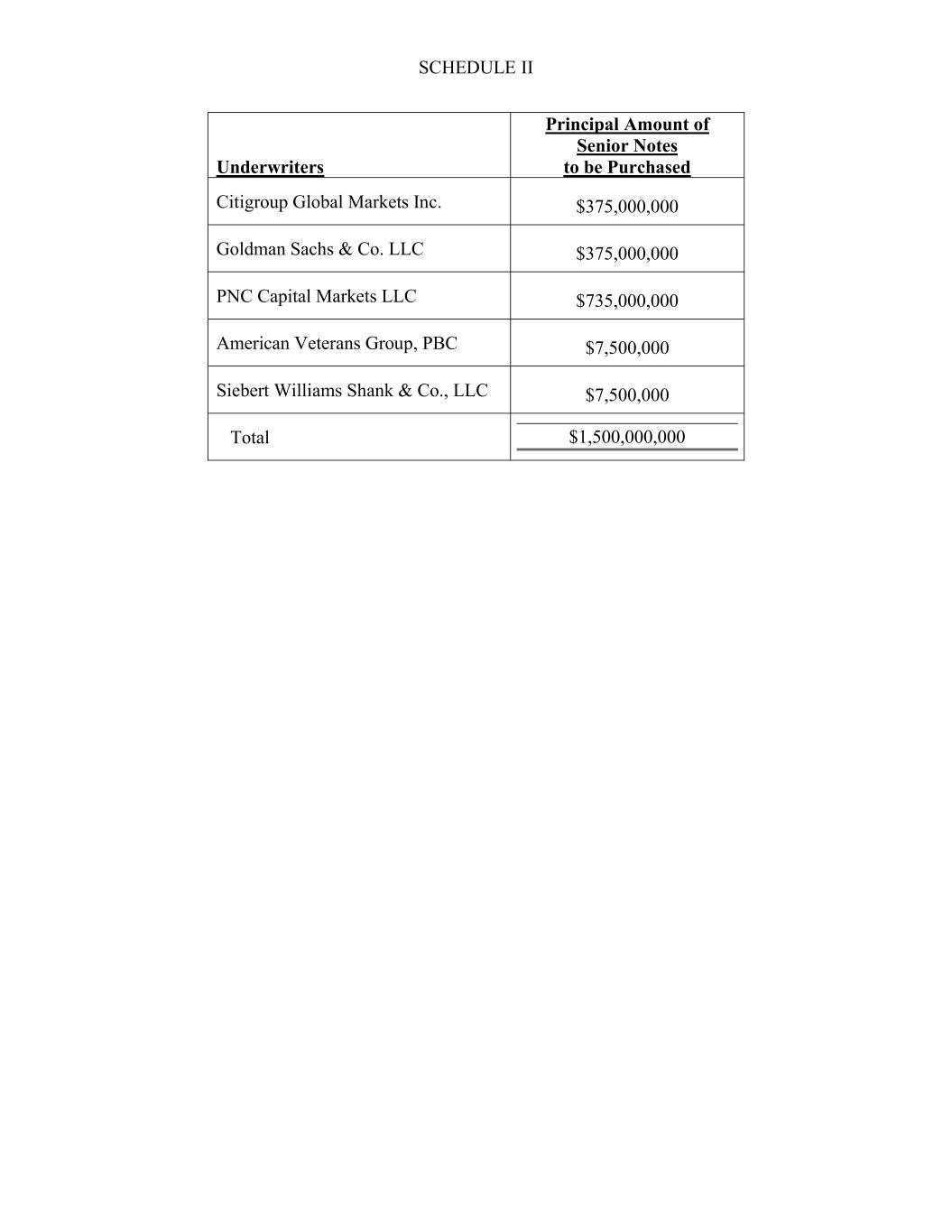SCHEDULE II Underwriters Principal Amount of Senior Notes to be Purchased Citigroup Global Markets Inc. $375,000,000 Goldman Sachs & Co. LLC $375,000,000 PNC Capital Markets LLC $735,000,000 American Veterans Group, PBC $7,500,000 Siebert Williams Shank & Co., LLC $7,500,000 Total $1,500,000,000