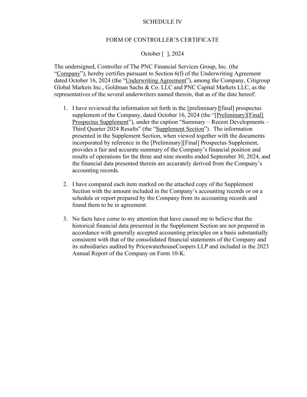 SCHEDULE IV FORM OF CONTROLLER’S CERTIFICATE October [ ], 2024 The undersigned, Controller of The PNC Financial Services Group, Inc. (the “Company”), hereby certifies pursuant to Section 6(f) of the Underwriting Agreement dated October 16, 2024 (the “Underwriting Agreement”), among the Company, Citigroup Global Markets Inc., Goldman Sachs & Co. LLC and PNC Capital Markets LLC, as the representatives of the several underwriters named therein, that as of the date hereof: 1. I have reviewed the information set forth in the [preliminary][final] prospectus supplement of the Company, dated October 16, 2024 (the “[Preliminary][Final] Prospectus Supplement”), under the caption “Summary – Recent Developments – Third Quarter 2024 Results” (the “Supplement Section”). The information presented in the Supplement Section, when viewed together with the documents incorporated by reference in the [Preliminary][Final] Prospectus Supplement, provides a fair and accurate summary of the Company’s financial position and results of operations for the three and nine months ended September 30, 2024, and the financial data presented therein are accurately derived from the Company’s accounting records. 2. I have compared each item marked on the attached copy of the Supplement Section with the amount included in the Company’s accounting records or on a schedule or report prepared by the Company from its accounting records and found them to be in agreement. 3. No facts have come to my attention that have caused me to believe that the historical financial data presented in the Supplement Section are not prepared in accordance with generally accepted accounting principles on a basis substantially consistent with that of the consolidated financial statements of the Company and its subsidiaries audited by PricewaterhouseCoopers LLP and included in the 2023 Annual Report of the Company on Form 10-K.