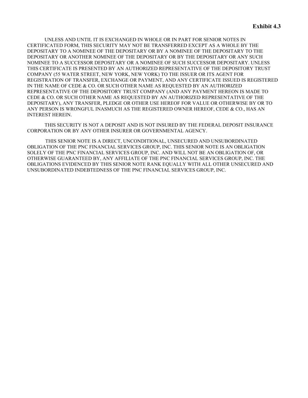 Exhibit 4.3 UNLESS AND UNTIL IT IS EXCHANGED IN WHOLE OR IN PART FOR SENIOR NOTES IN CERTIFICATED FORM, THIS SECURITY MAY NOT BE TRANSFERRED EXCEPT AS A WHOLE BY THE DEPOSITARY TO A NOMINEE OF THE DEPOSITARY OR BY A NOMINEE OF THE DEPOSITARY TO THE DEPOSITARY OR ANOTHER NOMINEE OF THE DEPOSITARY OR BY THE DEPOSITARY OR ANY SUCH NOMINEE TO A SUCCESSOR DEPOSITARY OR A NOMINEE OF SUCH SUCCESSOR DEPOSITARY. UNLESS THIS CERTIFICATE IS PRESENTED BY AN AUTHORIZED REPRESENTATIVE OF THE DEPOSITORY TRUST COMPANY (55 WATER STREET, NEW YORK, NEW YORK) TO THE ISSUER OR ITS AGENT FOR REGISTRATION OF TRANSFER, EXCHANGE OR PAYMENT, AND ANY CERTIFICATE ISSUED IS REGISTERED IN THE NAME OF CEDE & CO. OR SUCH OTHER NAME AS REQUESTED BY AN AUTHORIZED REPRESENTATIVE OF THE DEPOSITORY TRUST COMPANY (AND ANY PAYMENT HEREON IS MADE TO CEDE & CO. OR SUCH OTHER NAME AS REQUESTED BY AN AUTHORIZED REPRESENTATIVE OF THE DEPOSITARY), ANY TRANSFER, PLEDGE OR OTHER USE HEREOF FOR VALUE OR OTHERWISE BY OR TO ANY PERSON IS WRONGFUL INASMUCH AS THE REGISTERED OWNER HEREOF, CEDE & CO., HAS AN INTEREST HEREIN. THIS SECURITY IS NOT A DEPOSIT AND IS NOT INSURED BY THE FEDERAL DEPOSIT INSURANCE CORPORATION OR BY ANY OTHER INSURER OR GOVERNMENTAL AGENCY. THIS SENIOR NOTE IS A DIRECT, UNCONDITIONAL, UNSECURED AND UNSUBORDINATED OBLIGATION OF THE PNC FINANCIAL SERVICES GROUP, INC. THIS SENIOR NOTE IS AN OBLIGATION SOLELY OF THE PNC FINANCIAL SERVICES GROUP, INC. AND WILL NOT BE AN OBLIGATION OF, OR OTHERWISE GUARANTEED BY, ANY AFFILIATE OF THE PNC FINANCIAL SERVICES GROUP, INC. THE OBLIGATIONS EVIDENCED BY THIS SENIOR NOTE RANK EQUALLY WITH ALL OTHER UNSECURED AND UNSUBORDINATED INDEBTEDNESS OF THE PNC FINANCIAL SERVICES GROUP, INC.