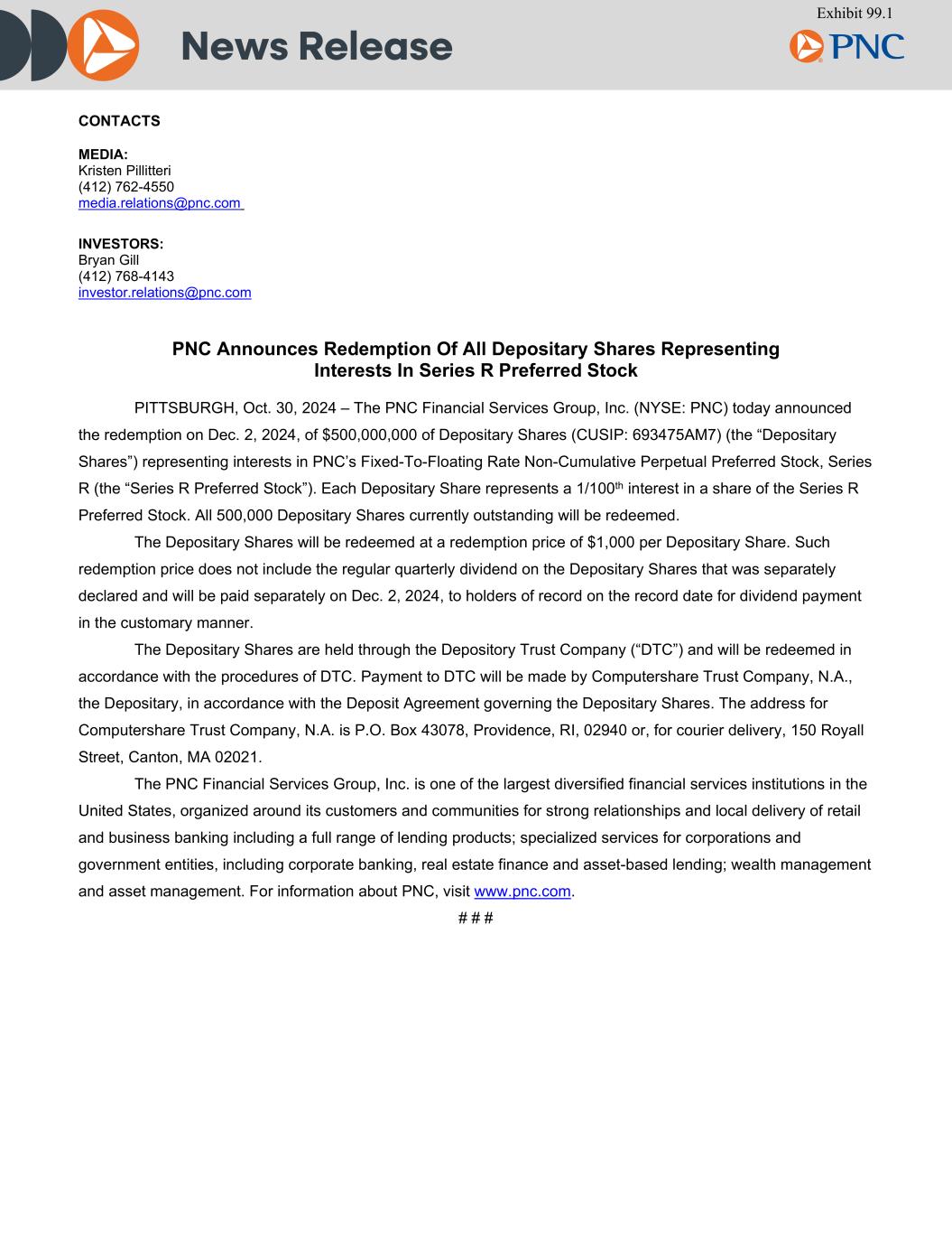 News Release CONTACTS MEDIA: Kristen Pillitteri (412) 762-4550 media.relations@pnc.com INVESTORS: Bryan Gill (412) 768-4143 investor.relations@pnc.com PNC Announces Redemption Of All Depositary Shares Representing Interests In Series R Preferred Stock PITTSBURGH, Oct. 30, 2024 – The PNC Financial Services Group, Inc. (NYSE: PNC) today announced the redemption on Dec. 2, 2024, of $500,000,000 of Depositary Shares (CUSIP: 693475AM7) (the “Depositary Shares”) representing interests in PNC’s Fixed-To-Floating Rate Non-Cumulative Perpetual Preferred Stock, Series R (the “Series R Preferred Stock”). Each Depositary Share represents a 1/100th interest in a share of the Series R Preferred Stock. All 500,000 Depositary Shares currently outstanding will be redeemed. The Depositary Shares will be redeemed at a redemption price of $1,000 per Depositary Share. Such redemption price does not include the regular quarterly dividend on the Depositary Shares that was separately declared and will be paid separately on Dec. 2, 2024, to holders of record on the record date for dividend payment in the customary manner. The Depositary Shares are held through the Depository Trust Company (“DTC”) and will be redeemed in accordance with the procedures of DTC. Payment to DTC will be made by Computershare Trust Company, N.A., the Depositary, in accordance with the Deposit Agreement governing the Depositary Shares. The address for Computershare Trust Company, N.A. is P.O. Box 43078, Providence, RI, 02940 or, for courier delivery, 150 Royall Street, Canton, MA 02021. The PNC Financial Services Group, Inc. is one of the largest diversified financial services institutions in the United States, organized around its customers and communities for strong relationships and local delivery of retail and business banking including a full range of lending products; specialized services for corporations and government entities, including corporate banking, real estate finance and asset-based lending; wealth management and asset management. For information about PNC, visit www.pnc.com. # # # Exhibit 99.1