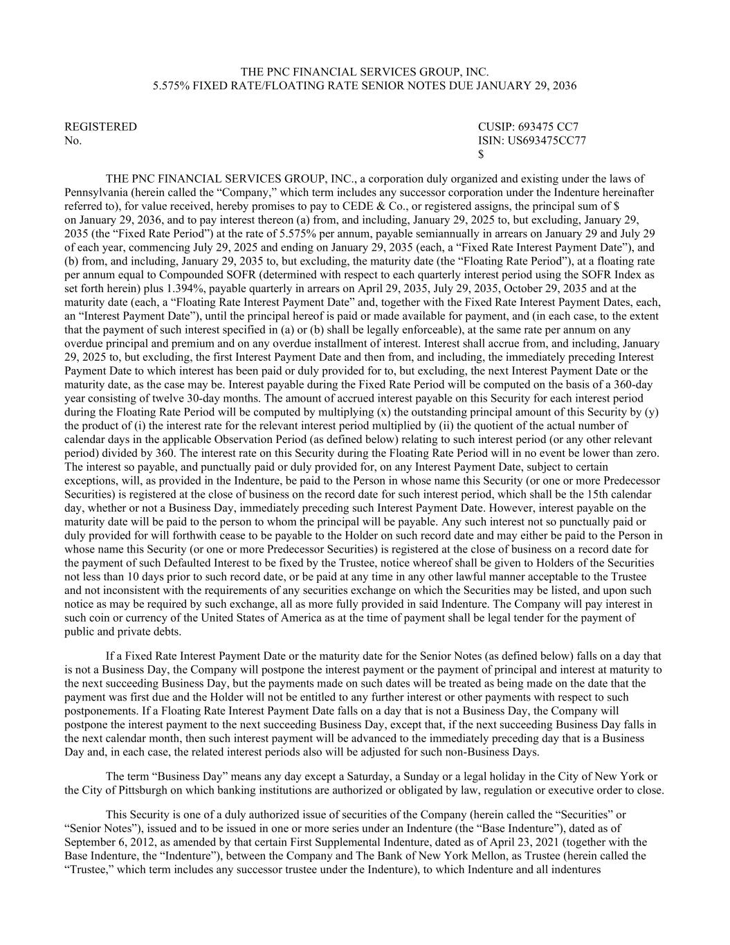 THE PNC FINANCIAL SERVICES GROUP, INC. 5.575% FIXED RATE/FLOATING RATE SENIOR NOTES DUE JANUARY 29, 2036 REGISTERED CUSIP: 693475 CC7 No. ISIN: US693475CC77 $ THE PNC FINANCIAL SERVICES GROUP, INC., a corporation duly organized and existing under the laws of Pennsylvania (herein called the “Company,” which term includes any successor corporation under the Indenture hereinafter referred to), for value received, hereby promises to pay to CEDE & Co., or registered assigns, the principal sum of $ on January 29, 2036, and to pay interest thereon (a) from, and including, January 29, 2025 to, but excluding, January 29, 2035 (the “Fixed Rate Period”) at the rate of 5.575% per annum, payable semiannually in arrears on January 29 and July 29 of each year, commencing July 29, 2025 and ending on January 29, 2035 (each, a “Fixed Rate Interest Payment Date”), and (b) from, and including, January 29, 2035 to, but excluding, the maturity date (the “Floating Rate Period”), at a floating rate per annum equal to Compounded SOFR (determined with respect to each quarterly interest period using the SOFR Index as set forth herein) plus 1.394%, payable quarterly in arrears on April 29, 2035, July 29, 2035, October 29, 2035 and at the maturity date (each, a “Floating Rate Interest Payment Date” and, together with the Fixed Rate Interest Payment Dates, each, an “Interest Payment Date”), until the principal hereof is paid or made available for payment, and (in each case, to the extent that the payment of such interest specified in (a) or (b) shall be legally enforceable), at the same rate per annum on any overdue principal and premium and on any overdue installment of interest. Interest shall accrue from, and including, January 29, 2025 to, but excluding, the first Interest Payment Date and then from, and including, the immediately preceding Interest Payment Date to which interest has been paid or duly provided for to, but excluding, the next Interest Payment Date or the maturity date, as the case may be. Interest payable during the Fixed Rate Period will be computed on the basis of a 360-day year consisting of twelve 30-day months. The amount of accrued interest payable on this Security for each interest period during the Floating Rate Period will be computed by multiplying (x) the outstanding principal amount of this Security by (y) the product of (i) the interest rate for the relevant interest period multiplied by (ii) the quotient of the actual number of calendar days in the applicable Observation Period (as defined below) relating to such interest period (or any other relevant period) divided by 360. The interest rate on this Security during the Floating Rate Period will in no event be lower than zero. The interest so payable, and punctually paid or duly provided for, on any Interest Payment Date, subject to certain exceptions, will, as provided in the Indenture, be paid to the Person in whose name this Security (or one or more Predecessor Securities) is registered at the close of business on the record date for such interest period, which shall be the 15th calendar day, whether or not a Business Day, immediately preceding such Interest Payment Date. However, interest payable on the maturity date will be paid to the person to whom the principal will be payable. Any such interest not so punctually paid or duly provided for will forthwith cease to be payable to the Holder on such record date and may either be paid to the Person in whose name this Security (or one or more Predecessor Securities) is registered at the close of business on a record date for the payment of such Defaulted Interest to be fixed by the Trustee, notice whereof shall be given to Holders of the Securities not less than 10 days prior to such record date, or be paid at any time in any other lawful manner acceptable to the Trustee and not inconsistent with the requirements of any securities exchange on which the Securities may be listed, and upon such notice as may be required by such exchange, all as more fully provided in said Indenture. The Company will pay interest in such coin or currency of the United States of America as at the time of payment shall be legal tender for the payment of public and private debts. If a Fixed Rate Interest Payment Date or the maturity date for the Senior Notes (as defined below) falls on a day that is not a Business Day, the Company will postpone the interest payment or the payment of principal and interest at maturity to the next succeeding Business Day, but the payments made on such dates will be treated as being made on the date that the payment was first due and the Holder will not be entitled to any further interest or other payments with respect to such postponements. If a Floating Rate Interest Payment Date falls on a day that is not a Business Day, the Company will postpone the interest payment to the next succeeding Business Day, except that, if the next succeeding Business Day falls in the next calendar month, then such interest payment will be advanced to the immediately preceding day that is a Business Day and, in each case, the related interest periods also will be adjusted for such non-Business Days. The term “Business Day” means any day except a Saturday, a Sunday or a legal holiday in the City of New York or the City of Pittsburgh on which banking institutions are authorized or obligated by law, regulation or executive order to close. This Security is one of a duly authorized issue of securities of the Company (herein called the “Securities” or “Senior Notes”), issued and to be issued in one or more series under an Indenture (the “Base Indenture”), dated as of September 6, 2012, as amended by that certain First Supplemental Indenture, dated as of April 23, 2021 (together with the Base Indenture, the “Indenture”), between the Company and The Bank of New York Mellon, as Trustee (herein called the “Trustee,” which term includes any successor truste