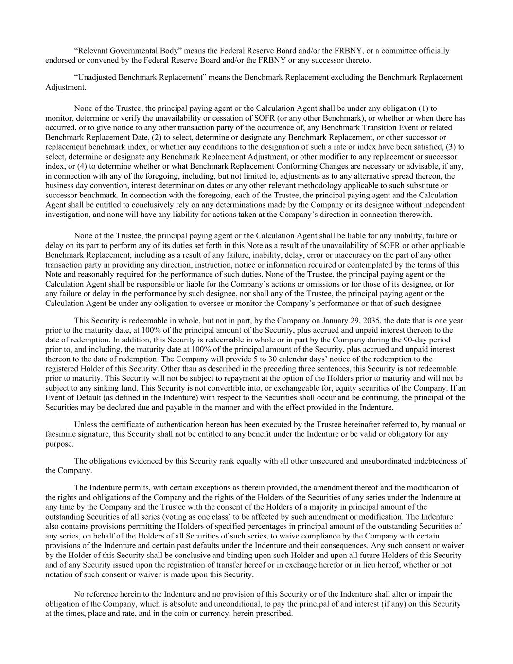 “Relevant Governmental Body” means the Federal Reserve Board and/or the FRBNY, or a committee officially endorsed or convened by the Federal Reserve Board and/or the FRBNY or any successor thereto. “Unadjusted Benchmark Replacement” means the Benchmark Replacement excluding the Benchmark Replacement Adjustment. None of the Trustee, the principal paying agent or the Calculation Agent shall be under any obligation (1) to monitor, determine or verify the unavailability or cessation of SOFR (or any other Benchmark), or whether or when there has occurred, or to give notice to any other transaction party of the occurrence of, any Benchmark Transition Event or related Benchmark Replacement Date, (2) to select, determine or designate any Benchmark Replacement, or other successor or replacement benchmark index, or whether any conditions to the designation of such a rate or index have been satisfied, (3) to select, determine or designate any Benchmark Replacement Adjustment, or other modifier to any replacement or successor index, or (4) to determine whether or what Benchmark Replacement Conforming Changes are necessary or advisable, if any, in connection with any of the foregoing, including, but not limited to, adjustments as to any alternative spread thereon, the business day convention, interest determination dates or any other relevant methodology applicable to such substitute or successor benchmark. In connection with the foregoing, each of the Trustee, the principal paying agent and the Calculation Agent shall be entitled to conclusively rely on any determinations made by the Company or its designee without independent investigation, and none will have any liability for actions taken at the Company’s direction in connection therewith. None of the Trustee, the principal paying agent or the Calculation Agent shall be liable for any inability, failure or delay on its part to perform any of its duties set forth in this Note as a result of the unavailability of SOFR or other applicable Benchmark Replacement, including as a result of any failure, inability, delay, error or inaccuracy on the part of any other transaction party in providing any direction, instruction, notice or information required or contemplated by the terms of this Note and reasonably required for the performance of such duties. None of the Trustee, the principal paying agent or the Calculation Agent shall be responsible or liable for the Company’s actions or omissions or for those of its designee, or for any failure or delay in the performance by such designee, nor shall any of the Trustee, the principal paying agent or the Calculation Agent be under any obligation to oversee or monitor the Company’s performance or that of such designee. This Security is redeemable in whole, but not in part, by the Company on January 29, 2035, the date that is one year prior to the maturity date, at 100% of the principal amount of the Security, plus accrued and unpaid interest thereon to the date of redemption. In addition, this Security is redeemable in whole or in part by the Company during the 90-day period prior to, and including, the maturity date at 100% of the principal amount of the Security, plus accrued and unpaid interest thereon to the date of redemption. The Company will provide 5 to 30 calendar days’ notice of the redemption to the registered Holder of this Security. Other than as described in the preceding three sentences, this Security is not redeemable prior to maturity. This Security will not be subject to repayment at the option of the Holders prior to maturity and will not be subject to any sinking fund. This Security is not convertible into, or exchangeable for, equity securities of the Company. If an Event of Default (as defined in the Indenture) with respect to the Securities shall occur and be continuing, the principal of the Securities may be declared due and payable in the manner and with the effect provided in the Indenture. Unless the certificate of authentication hereon has been executed by the Trustee hereinafter referred to, by manual or facsimile signature, this Security shall not be entitled to any benefit under the Indenture or be valid or obligatory for any purpose. The obligations evidenced by this Security rank equally with all other unsecured and unsubordinated indebtedness of the Company. The Indenture permits, with certain exceptions as therein provided, the amendment thereof and the modification of the rights and obligations of the Company and the rights of the Holders of the Securities of any series under the Indenture at any time by the Company and the Trustee with the consent of the Holders of a majority in principal amount of the outstanding Securities of all series (voting as one class) to be affected by such amendment or modification. The Indenture also contains provisions permitting the Holders of specified percentages in principal amount of the outstanding Securities of any series, on behalf of the Holders of all Securities of such series, to waive compliance by the Company with certain provisions of the Indenture and certain past defaults under the Indenture and their consequences. Any such consent or waiver by the Holder of this Security shall be conclusive and binding upon such Holder and upon all future Holders of this Security and of any Security issued upon the registration of transfer hereof or in exchange herefor or in lieu hereof, whether or not notation of such consent or waiver is made upon this Security. No reference herein to the Indenture and no provision of this Security or of the Indenture shall alter or impair the obligation of the Company, which is absolute and unconditional, to pay the principal of and interest (if any) on this Security at the times, place and rate, and in the coin or currency, herein prescribed.