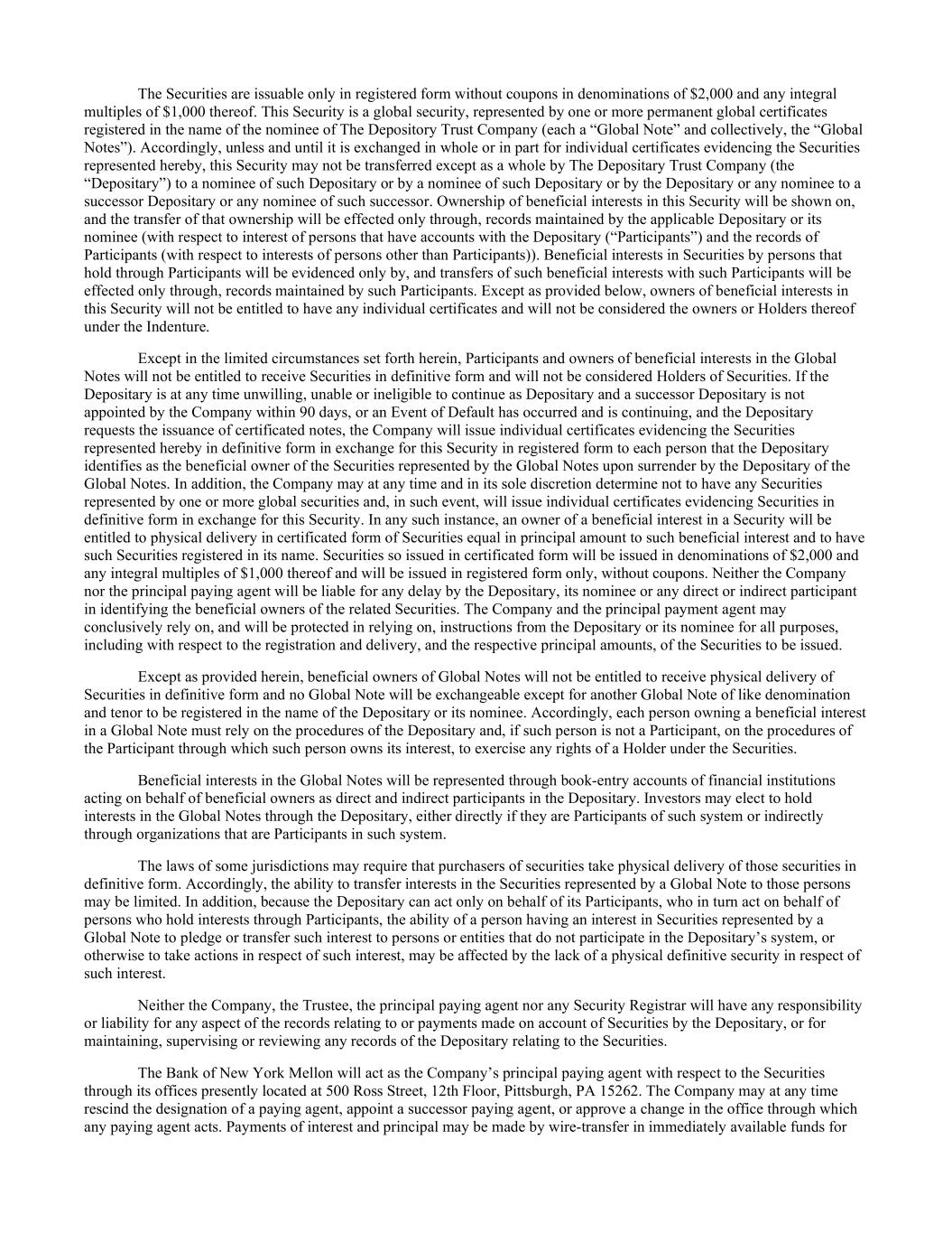 The Securities are issuable only in registered form without coupons in denominations of $2,000 and any integral multiples of $1,000 thereof. This Security is a global security, represented by one or more permanent global certificates registered in the name of the nominee of The Depository Trust Company (each a “Global Note” and collectively, the “Global Notes”). Accordingly, unless and until it is exchanged in whole or in part for individual certificates evidencing the Securities represented hereby, this Security may not be transferred except as a whole by The Depositary Trust Company (the “Depositary”) to a nominee of such Depositary or by a nominee of such Depositary or by the Depositary or any nominee to a successor Depositary or any nominee of such successor. Ownership of beneficial interests in this Security will be shown on, and the transfer of that ownership will be effected only through, records maintained by the applicable Depositary or its nominee (with respect to interest of persons that have accounts with the Depositary (“Participants”) and the records of Participants (with respect to interests of persons other than Participants)). Beneficial interests in Securities by persons that hold through Participants will be evidenced only by, and transfers of such beneficial interests with such Participants will be effected only through, records maintained by such Participants. Except as provided below, owners of beneficial interests in this Security will not be entitled to have any individual certificates and will not be considered the owners or Holders thereof under the Indenture. Except in the limited circumstances set forth herein, Participants and owners of beneficial interests in the Global Notes will not be entitled to receive Securities in definitive form and will not be considered Holders of Securities. If the Depositary is at any time unwilling, unable or ineligible to continue as Depositary and a successor Depositary is not appointed by the Company within 90 days, or an Event of Default has occurred and is continuing, and the Depositary requests the issuance of certificated notes, the Company will issue individual certificates evidencing the Securities represented hereby in definitive form in exchange for this Security in registered form to each person that the Depositary identifies as the beneficial owner of the Securities represented by the Global Notes upon surrender by the Depositary of the Global Notes. In addition, the Company may at any time and in its sole discretion determine not to have any Securities represented by one or more global securities and, in such event, will issue individual certificates evidencing Securities in definitive form in exchange for this Security. In any such instance, an owner of a beneficial interest in a Security will be entitled to physical delivery in certificated form of Securities equal in principal amount to such beneficial interest and to have such Securities registered in its name. Securities so issued in certificated form will be issued in denominations of $2,000 and any integral multiples of $1,000 thereof and will be issued in registered form only, without coupons. Neither the Company nor the principal paying agent will be liable for any delay by the Depositary, its nominee or any direct or indirect participant in identifying the beneficial owners of the related Securities. The Company and the principal payment agent may conclusively rely on, and will be protected in relying on, instructions from the Depositary or its nominee for all purposes, including with respect to the registration and delivery, and the respective principal amounts, of the Securities to be issued. Except as provided herein, beneficial owners of Global Notes will not be entitled to receive physical delivery of Securities in definitive form and no Global Note will be exchangeable except for another Global Note of like denomination and tenor to be registered in the name of the Depositary or its nominee. Accordingly, each person owning a beneficial interest in a Global Note must rely on the procedures of the Depositary and, if such person is not a Participant, on the procedures of the Participant through which such person owns its interest, to exercise any rights of a Holder under the Securities. Beneficial interests in the Global Notes will be represented through book-entry accounts of financial institutions acting on behalf of beneficial owners as direct and indirect participants in the Depositary. Investors may elect to hold interests in the Global Notes through the Depositary, either directly if they are Participants of such system or indirectly through organizations that are Participants in such system. The laws of some jurisdictions may require that purchasers of securities take physical delivery of those securities in definitive form. Accordingly, the ability to transfer interests in the Securities represented by a Global Note to those persons may be limited. In addition, because the Depositary can act only on behalf of its Participants, who in turn act on behalf of persons who hold interests through Participants, the ability of a person having an interest in Securities represented by a Global Note to pledge or transfer such interest to persons or entities that do not participate in the Depositary’s system, or otherwise to take actions in respect of such interest, may be affected by the lack of a physical definitive security in respect of such interest. Neither the Company, the Trustee, the principal paying agent nor any Security Registrar will have any responsibility or liability for any aspect of the records relating to or payments made on account of Securities by the Depositary, or for maintaining, supervising or reviewing any records of the Depositary relating to the Securities. The Bank of New York Mellon will act as the Company’s principal paying agent with respect to the Securities through its offices presently located at 500 Ro
