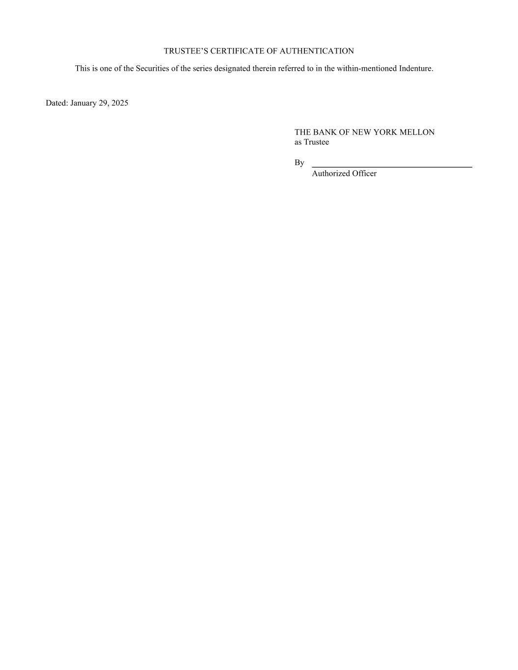 TRUSTEE’S CERTIFICATE OF AUTHENTICATION This is one of the Securities of the series designated therein referred to in the within-mentioned Indenture. Dated: January 29, 2025 THE BANK OF NEW YORK MELLON as Trustee By Authorized Officer