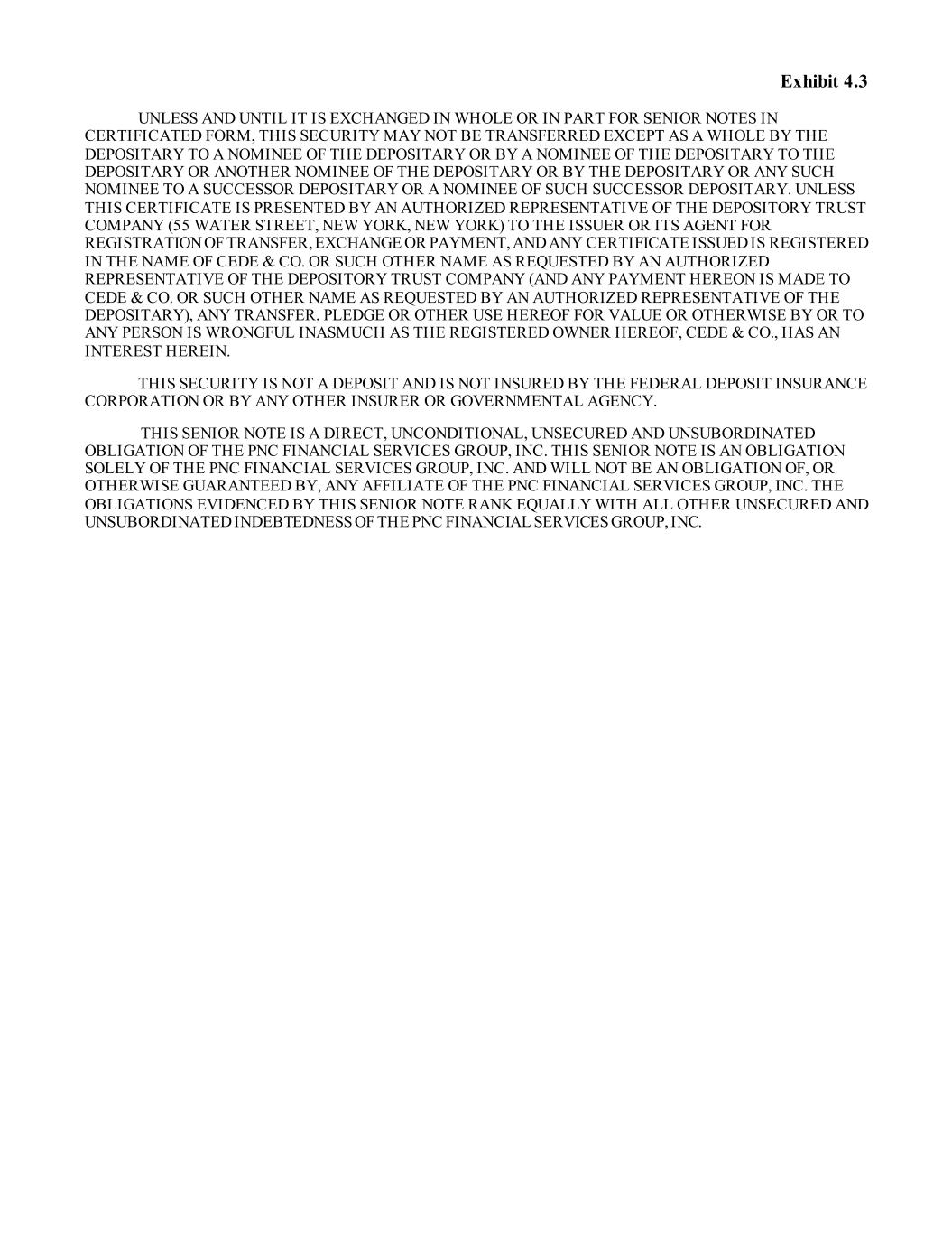 Exhibit 4.3 UNLESS AND UNTIL IT IS EXCHANGED IN WHOLE OR IN PART FOR SENIOR NOTES IN CERTIFICATED FORM, THIS SECURITY MAY NOT BE TRANSFERRED EXCEPT AS A WHOLE BY THE DEPOSITARY TO A NOMINEE OF THE DEPOSITARY OR BY A NOMINEE OF THE DEPOSITARY TO THE DEPOSITARY OR ANOTHER NOMINEE OF THE DEPOSITARY OR BY THE DEPOSITARY OR ANY SUCH NOMINEE TO A SUCCESSOR DEPOSITARY OR A NOMINEE OF SUCH SUCCESSOR DEPOSITARY. UNLESS THIS CERTIFICATE IS PRESENTED BY AN AUTHORIZED REPRESENTATIVE OF THE DEPOSITORY TRUST COMPANY (55 WATER STREET, NEW YORK, NEW YORK) TO THE ISSUER OR ITS AGENT FOR REGISTRATION OF TRANSFER, EXCHANGE OR PAYMENT, AND ANY CERTIFICATE ISSUED IS REGISTERED IN THE NAME OF CEDE & CO. OR SUCH OTHER NAME AS REQUESTED BY AN AUTHORIZED REPRESENTATIVE OF THE DEPOSITORY TRUST COMPANY (AND ANY PAYMENT HEREON IS MADE TO CEDE & CO. OR SUCH OTHER NAME AS REQUESTED BY AN AUTHORIZED REPRESENTATIVE OF THE DEPOSITARY), ANY TRANSFER, PLEDGE OR OTHER USE HEREOF FOR VALUE OR OTHERWISE BY OR TO ANY PERSON IS WRONGFUL INASMUCH AS THE REGISTERED OWNER HEREOF, CEDE & CO., HAS AN INTEREST HEREIN. THIS SECURITY IS NOT A DEPOSIT AND IS NOT INSURED BY THE FEDERAL DEPOSIT INSURANCE CORPORATION OR BY ANY OTHER INSURER OR GOVERNMENTAL AGENCY. THIS SENIOR NOTE IS A DIRECT, UNCONDITIONAL, UNSECURED AND UNSUBORDINATED OBLIGATION OF THE PNC FINANCIAL SERVICES GROUP, INC. THIS SENIOR NOTE IS AN OBLIGATION SOLELY OF THE PNC FINANCIAL SERVICES GROUP, INC. AND WILL NOT BE AN OBLIGATION OF, OR OTHERWISE GUARANTEED BY, ANY AFFILIATE OF THE PNC FINANCIAL SERVICES GROUP, INC. THE OBLIGATIONS EVIDENCED BY THIS SENIOR NOTE RANK EQUALLY WITH ALL OTHER UNSECURED AND UNSUBORDINATED INDEBTEDNESS OF THE PNC FINANCIAL SERVICES GROUP, INC.