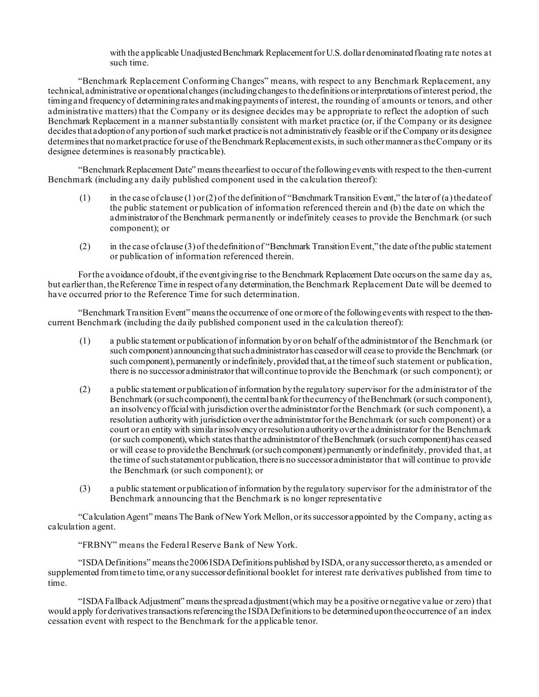 with the applicable Unadjusted Benchmark Replacement for U.S. dollar denominated floating rate notes at such time. “Benchmark Replacement Conforming Changes” means, with respect to any Benchmark Replacement, any technical, administrative or operational changes (including changes to the definitions or interpretations of interest period, the timing and frequency of determining rates and making payments of interest, the rounding of amounts or tenors, and other administrative matters) that the Company or its designee decides may be appropriate to reflect the adoption of such Benchmark Replacement in a manner substantially consistent with market practice (or, if the Company or its designee decides that adoption of any portion of such market practice is not administratively feasible or if the Company or its designee determines that no market practice for use of the Benchmark Replacement exists, in such other manner as the Company or its designee determines is reasonably practicable). “Benchmark Replacement Date” means the earliest to occur of the following events with respect to the then-current Benchmark (including any daily published component used in the calculation thereof): (1) in the case of clause (1) or (2) of the definition of “Benchmark Transition Event,” the later of (a) the date of the public statement or publication of information referenced therein and (b) the date on which the administrator of the Benchmark permanently or indefinitely ceases to provide the Benchmark (or such component); or (2) in the case of clause (3) of the definition of “Benchmark Transition Event,” the date of the public statement or publication of information referenced therein. For the avoidance of doubt, if the event giving rise to the Benchmark Replacement Date occurs on the same day as, but earlier than, the Reference Time in respect of any determination, the Benchmark Replacement Date will be deemed to have occurred prior to the Reference Time for such determination. “Benchmark Transition Event” means the occurrence of one or more of the following events with respect to the then- current Benchmark (including the daily published component used in the calculation thereof): (1) a public statement or publication of information by or on behalf of the administrator of the Benchmark (or such component) announcing that such administrator has ceased or will cease to provide the Benchmark (or such component), permanently or indefinitely, provided that, at the time of such statement or publication, there is no successor administrator that will continue to provide the Benchmark (or such component); or (2) a public statement or publication of information by the regulatory supervisor for the administrator of the Benchmark (or such component), the central bank for the currency of the Benchmark (or such component), an insolvency official with jurisdiction over the administrator for the Benchmark (or such component), a resolution authority with jurisdiction over the administrator for the Benchmark (or such component) or a court or an entity with similar insolvency or resolution authority over the administrator for the Benchmark (or such component), which states that the administrator of the Benchmark (or such component) has ceased or will cease to provide the Benchmark (or such component) permanently or indefinitely, provided that, at the time of such statement or publication, there is no successor administrator that will continue to provide the Benchmark (or such component); or (3) a public statement or publication of information by the regulatory supervisor for the administrator of the Benchmark announcing that the Benchmark is no longer representative “Calculation Agent” means The Bank of New York Mellon, or its successor appointed by the Company, acting as calculation agent. “FRBNY” means the Federal Reserve Bank of New York. “ISDA Definitions” means the 2006 ISDA Definitions published by ISDA, or any successor thereto, as amended or supplemented from time to time, or any successor definitional booklet for interest rate derivatives published from time to time. “ISDA Fallback Adjustment” means the spread adjustment (which may be a positive or negative value or zero) that would apply for derivatives transactions referencing the ISDA Definitions to be determined upon the occurrence of an index cessation event with respect to the Benchmark for the applicable tenor.