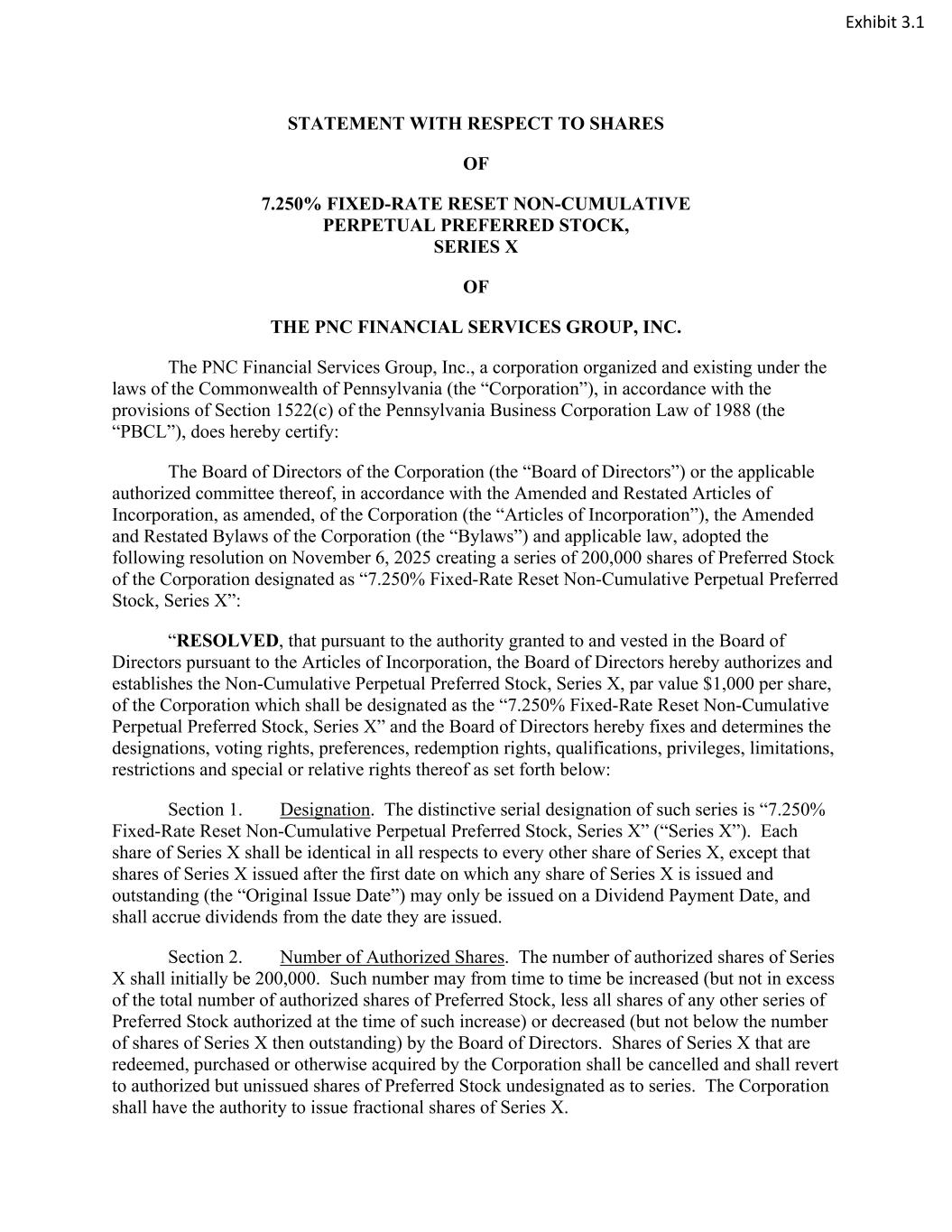 STATEMENT WITH RESPECT TO SHARES OF 7.250% FIXED-RATE RESET NON-CUMULATIVE PERPETUAL PREFERRED STOCK, SERIES X OF THE PNC FINANCIAL SERVICES GROUP, INC. The PNC Financial Services Group, Inc., a corporation organized and existing under the laws of the Commonwealth of Pennsylvania (the “Corporation”), in accordance with the provisions of Section 1522(c) of the Pennsylvania Business Corporation Law of 1988 (the “PBCL”), does hereby certify: The Board of Directors of the Corporation (the “Board of Directors”) or the applicable authorized committee thereof, in accordance with the Amended and Restated Articles of Incorporation, as amended, of the Corporation (the “Articles of Incorporation”), the Amended and Restated Bylaws of the Corporation (the “Bylaws”) and applicable law, adopted the following resolution on November 6, 2025 creating a series of 200,000 shares of Preferred Stock of the Corporation designated as “7.250% Fixed-Rate Reset Non-Cumulative Perpetual Preferred Stock, Series X”: “RESOLVED, that pursuant to the authority granted to and vested in the Board of Directors pursuant to the Articles of Incorporation, the Board of Directors hereby authorizes and establishes the Non-Cumulative Perpetual Preferred Stock, Series X, par value $1,000 per share, of the Corporation which shall be designated as the “7.250% Fixed-Rate Reset Non-Cumulative Perpetual Preferred Stock, Series X” and the Board of Directors hereby fixes and determines the designations, voting rights, preferences, redemption rights, qualifications, privileges, limitations, restrictions and special or relative rights thereof as set forth below: Section 1. Designation. The distinctive serial designation of such series is “7.250% Fixed-Rate Reset Non-Cumulative Perpetual Preferred Stock, Series X” (“Series X”). Each share of Series X shall be identical in all respects to every other share of Series X, except that shares of Series X issued after the first date on which any share of Series X is issued and outstanding (the “Original Issue Date”) may only be issued on a Dividend Payment Date, and shall accrue dividends from the date they are issued. Section 2. Number of Authorized Shares. The number of authorized shares of Series X shall initially be 200,000. Such number may from time to time be increased (but not in excess of the total number of authorized shares of Preferred Stock, less all shares of any other series of Preferred Stock authorized at the time of such increase) or decreased (but not below the number of shares of Series X then outstanding) by the Board of Directors. Shares of Series X that are redeemed, purchased or otherwise acquired by the Corporation shall be cancelled and shall revert to authorized but unissued shares of Preferred Stock undesignated as to series. The Corporation shall have the authority to issue fractional shares of Series X. Exhibit 3.1