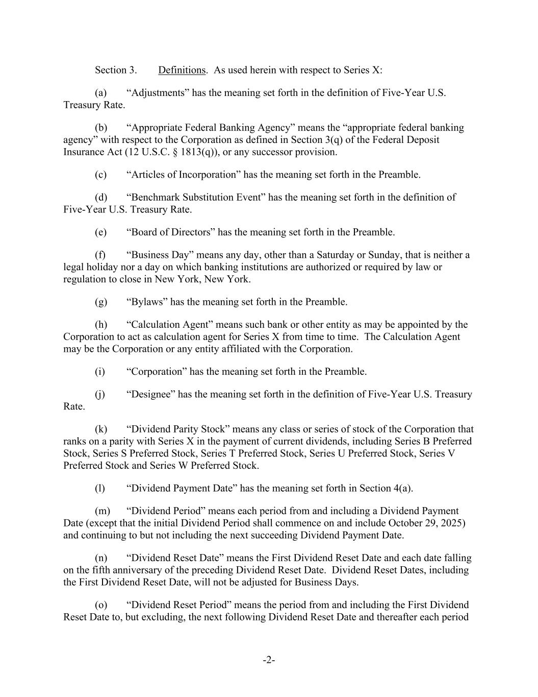 -2- Section 3. Definitions. As used herein with respect to Series X: (a) “Adjustments” has the meaning set forth in the definition of Five-Year U.S. Treasury Rate. (b) “Appropriate Federal Banking Agency” means the “appropriate federal banking agency” with respect to the Corporation as defined in Section 3(q) of the Federal Deposit Insurance Act (12 U.S.C. § 1813(q)), or any successor provision. (c) “Articles of Incorporation” has the meaning set forth in the Preamble. (d) “Benchmark Substitution Event” has the meaning set forth in the definition of Five-Year U.S. Treasury Rate. (e) “Board of Directors” has the meaning set forth in the Preamble. (f) “Business Day” means any day, other than a Saturday or Sunday, that is neither a legal holiday nor a day on which banking institutions are authorized or required by law or regulation to close in New York, New York. (g) “Bylaws” has the meaning set forth in the Preamble. (h) “Calculation Agent” means such bank or other entity as may be appointed by the Corporation to act as calculation agent for Series X from time to time. The Calculation Agent may be the Corporation or any entity affiliated with the Corporation. (i) “Corporation” has the meaning set forth in the Preamble. (j) “Designee” has the meaning set forth in the definition of Five-Year U.S. Treasury Rate. (k) “Dividend Parity Stock” means any class or series of stock of the Corporation that ranks on a parity with Series X in the payment of current dividends, including Series B Preferred Stock, Series S Preferred Stock, Series T Preferred Stock, Series U Preferred Stock, Series V Preferred Stock and Series W Preferred Stock. (l) “Dividend Payment Date” has the meaning set forth in Section 4(a). (m) “Dividend Period” means each period from and including a Dividend Payment Date (except that the initial Dividend Period shall commence on and include October 29, 2025) and continuing to but not including the next succeeding Dividend Payment Date. (n) “Dividend Reset Date” means the First Dividend Reset Date and each date falling on the fifth anniversary of the preceding Dividend Reset Date. Dividend Reset Dates, including the First Dividend Reset Date, will not be adjusted for Business Days. (o) “Dividend Reset Period” means the period from and including the First Dividend Reset Date to, but excluding, the next following Dividend Reset Date and thereafter each period