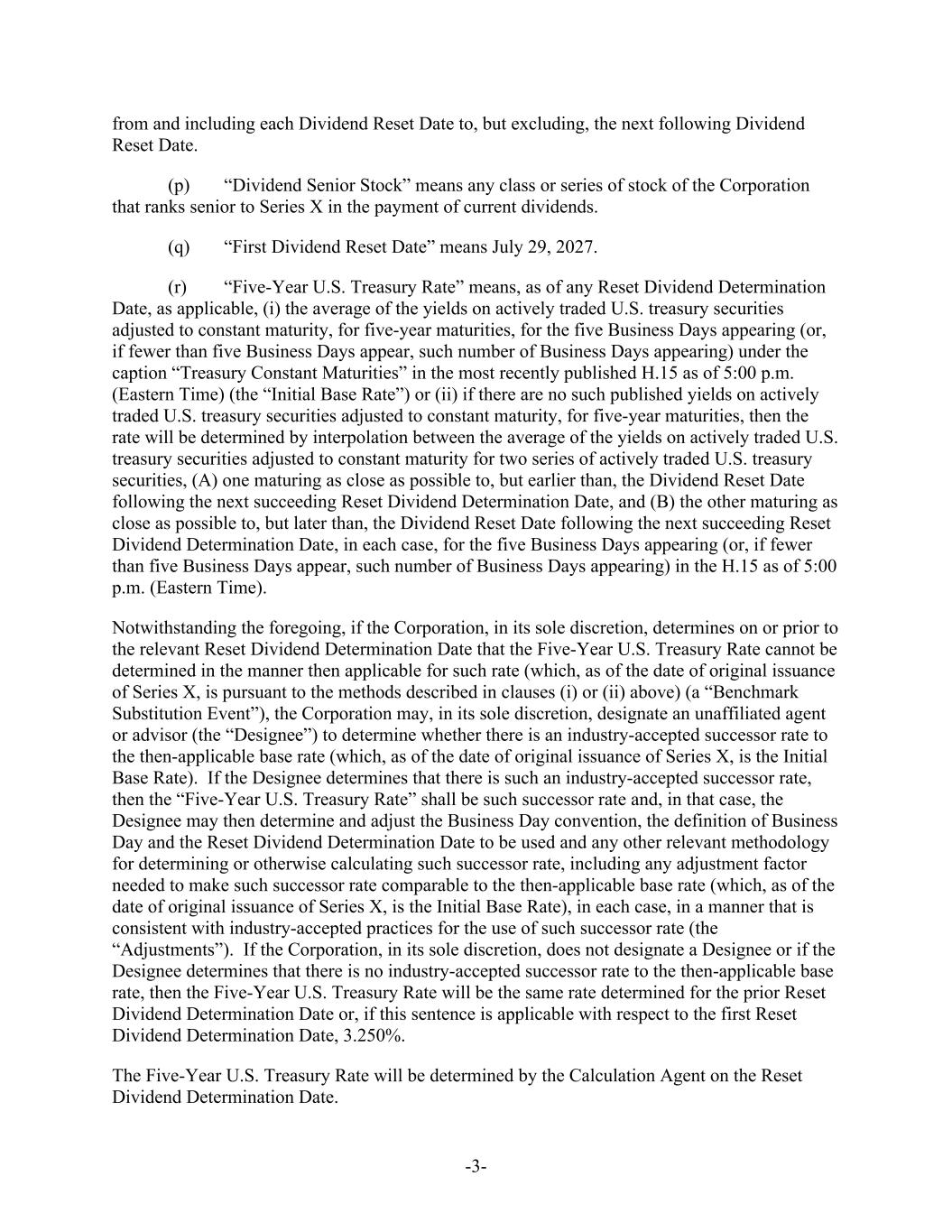 -3- from and including each Dividend Reset Date to, but excluding, the next following Dividend Reset Date. (p) “Dividend Senior Stock” means any class or series of stock of the Corporation that ranks senior to Series X in the payment of current dividends. (q) “First Dividend Reset Date” means July 29, 2027. (r) “Five-Year U.S. Treasury Rate” means, as of any Reset Dividend Determination Date, as applicable, (i) the average of the yields on actively traded U.S. treasury securities adjusted to constant maturity, for five-year maturities, for the five Business Days appearing (or, if fewer than five Business Days appear, such number of Business Days appearing) under the caption “Treasury Constant Maturities” in the most recently published H.15 as of 5:00 p.m. (Eastern Time) (the “Initial Base Rate”) or (ii) if there are no such published yields on actively traded U.S. treasury securities adjusted to constant maturity, for five-year maturities, then the rate will be determined by interpolation between the average of the yields on actively traded U.S. treasury securities adjusted to constant maturity for two series of actively traded U.S. treasury securities, (A) one maturing as close as possible to, but earlier than, the Dividend Reset Date following the next succeeding Reset Dividend Determination Date, and (B) the other maturing as close as possible to, but later than, the Dividend Reset Date following the next succeeding Reset Dividend Determination Date, in each case, for the five Business Days appearing (or, if fewer than five Business Days appear, such number of Business Days appearing) in the H.15 as of 5:00 p.m. (Eastern Time). Notwithstanding the foregoing, if the Corporation, in its sole discretion, determines on or prior to the relevant Reset Dividend Determination Date that the Five-Year U.S. Treasury Rate cannot be determined in the manner then applicable for such rate (which, as of the date of original issuance of Series X, is pursuant to the methods described in clauses (i) or (ii) above) (a “Benchmark Substitution Event”), the Corporation may, in its sole discretion, designate an unaffiliated agent or advisor (the “Designee”) to determine whether there is an industry-accepted successor rate to the then-applicable base rate (which, as of the date of original issuance of Series X, is the Initial Base Rate). If the Designee determines that there is such an industry-accepted successor rate, then the “Five-Year U.S. Treasury Rate” shall be such successor rate and, in that case, the Designee may then determine and adjust the Business Day convention, the definition of Business Day and the Reset Dividend Determination Date to be used and any other relevant methodology for determining or otherwise calculating such successor rate, including any adjustment factor needed to make such successor rate comparable to the then-applicable base rate (which, as of the date of original issuance of Series X, is the Initial Base Rate), in each case, in a manner that is consistent with industry-accepted practices for the use of such successor rate (the “Adjustments”). If the Corporation, in its sole discretion, does not designate a Designee or if the Designee determines that there is no industry-accepted successor rate to the then-applicable base rate, then the Five-Year U.S. Treasury Rate will be the same rate determined for the prior Reset Dividend Determination Date or, if this sentence is applicable with respect to the first Reset Dividend Determination Date, 3.250%. The Five-Year U.S. Treasury Rate will be determined by the Calculation Agent on the Reset Dividend Determination Date.