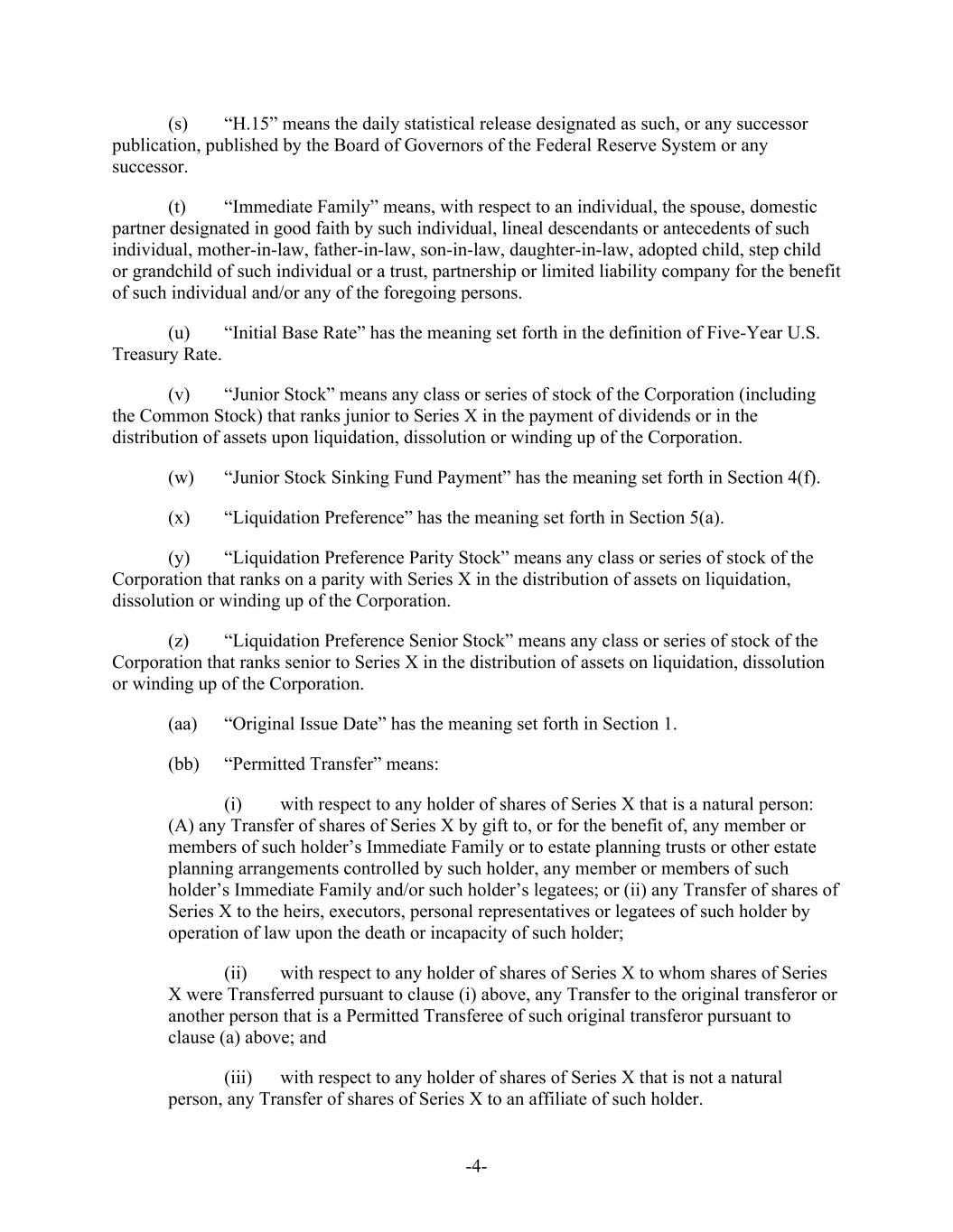 -4- (s) “H.15” means the daily statistical release designated as such, or any successor publication, published by the Board of Governors of the Federal Reserve System or any successor. (t) “Immediate Family” means, with respect to an individual, the spouse, domestic partner designated in good faith by such individual, lineal descendants or antecedents of such individual, mother-in-law, father-in-law, son-in-law, daughter-in-law, adopted child, step child or grandchild of such individual or a trust, partnership or limited liability company for the benefit of such individual and/or any of the foregoing persons. (u) “Initial Base Rate” has the meaning set forth in the definition of Five-Year U.S. Treasury Rate. (v) “Junior Stock” means any class or series of stock of the Corporation (including the Common Stock) that ranks junior to Series X in the payment of dividends or in the distribution of assets upon liquidation, dissolution or winding up of the Corporation. (w) “Junior Stock Sinking Fund Payment” has the meaning set forth in Section 4(f). (x) “Liquidation Preference” has the meaning set forth in Section 5(a). (y) “Liquidation Preference Parity Stock” means any class or series of stock of the Corporation that ranks on a parity with Series X in the distribution of assets on liquidation, dissolution or winding up of the Corporation. (z) “Liquidation Preference Senior Stock” means any class or series of stock of the Corporation that ranks senior to Series X in the distribution of assets on liquidation, dissolution or winding up of the Corporation. (aa) “Original Issue Date” has the meaning set forth in Section 1. (bb) “Permitted Transfer” means: (i) with respect to any holder of shares of Series X that is a natural person: (A) any Transfer of shares of Series X by gift to, or for the benefit of, any member or members of such holder’s Immediate Family or to estate planning trusts or other estate planning arrangements controlled by such holder, any member or members of such holder’s Immediate Family and/or such holder’s legatees; or (ii) any Transfer of shares of Series X to the heirs, executors, personal representatives or legatees of such holder by operation of law upon the death or incapacity of such holder; (ii) with respect to any holder of shares of Series X to whom shares of Series X were Transferred pursuant to clause (i) above, any Transfer to the original transferor or another person that is a Permitted Transferee of such original transferor pursuant to clause (a) above; and (iii) with respect to any holder of shares of Series X that is not a natural person, any Transfer of shares of Series X to an affiliate of such holder.