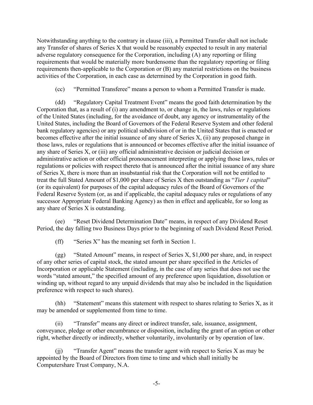 -5- Notwithstanding anything to the contrary in clause (iii), a Permitted Transfer shall not include any Transfer of shares of Series X that would be reasonably expected to result in any material adverse regulatory consequence for the Corporation, including (A) any reporting or filing requirements that would be materially more burdensome than the regulatory reporting or filing requirements then-applicable to the Corporation or (B) any material restrictions on the business activities of the Corporation, in each case as determined by the Corporation in good faith. (cc) “Permitted Transferee” means a person to whom a Permitted Transfer is made. (dd) “Regulatory Capital Treatment Event” means the good faith determination by the Corporation that, as a result of (i) any amendment to, or change in, the laws, rules or regulations of the United States (including, for the avoidance of doubt, any agency or instrumentality of the United States, including the Board of Governors of the Federal Reserve System and other federal bank regulatory agencies) or any political subdivision of or in the United States that is enacted or becomes effective after the initial issuance of any share of Series X, (ii) any proposed change in those laws, rules or regulations that is announced or becomes effective after the initial issuance of any share of Series X, or (iii) any official administrative decision or judicial decision or administrative action or other official pronouncement interpreting or applying those laws, rules or regulations or policies with respect thereto that is announced after the initial issuance of any share of Series X, there is more than an insubstantial risk that the Corporation will not be entitled to treat the full Stated Amount of $1,000 per share of Series X then outstanding as “Tier 1 capital” (or its equivalent) for purposes of the capital adequacy rules of the Board of Governors of the Federal Reserve System (or, as and if applicable, the capital adequacy rules or regulations of any successor Appropriate Federal Banking Agency) as then in effect and applicable, for so long as any share of Series X is outstanding. (ee) “Reset Dividend Determination Date” means, in respect of any Dividend Reset Period, the day falling two Business Days prior to the beginning of such Dividend Reset Period. (ff) “Series X” has the meaning set forth in Section 1. (gg) “Stated Amount” means, in respect of Series X, $1,000 per share, and, in respect of any other series of capital stock, the stated amount per share specified in the Articles of Incorporation or applicable Statement (including, in the case of any series that does not use the words “stated amount,” the specified amount of any preference upon liquidation, dissolution or winding up, without regard to any unpaid dividends that may also be included in the liquidation preference with respect to such shares). (hh) “Statement” means this statement with respect to shares relating to Series X, as it may be amended or supplemented from time to time. (ii) “Transfer” means any direct or indirect transfer, sale, issuance, assignment, conveyance, pledge or other encumbrance or disposition, including the grant of an option or other right, whether directly or indirectly, whether voluntarily, involuntarily or by operation of law. (jj) “Transfer Agent” means the transfer agent with respect to Series X as may be appointed by the Board of Directors from time to time and which shall initially be Computershare Trust Company, N.A.