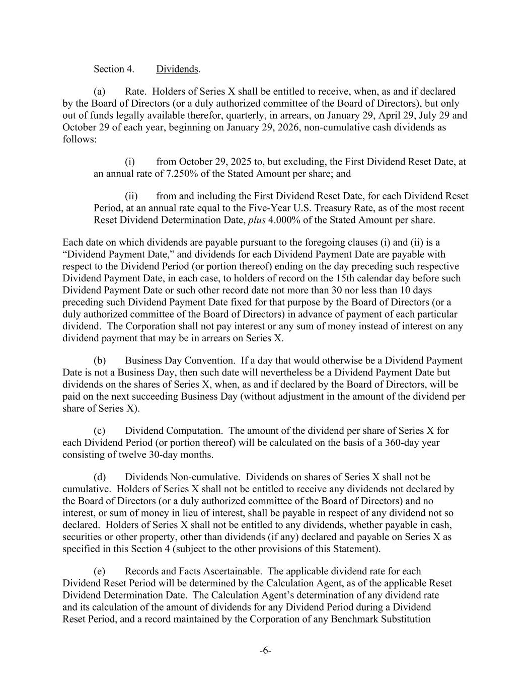 -6- Section 4. Dividends. (a) Rate. Holders of Series X shall be entitled to receive, when, as and if declared by the Board of Directors (or a duly authorized committee of the Board of Directors), but only out of funds legally available therefor, quarterly, in arrears, on January 29, April 29, July 29 and October 29 of each year, beginning on January 29, 2026, non-cumulative cash dividends as follows: (i) from October 29, 2025 to, but excluding, the First Dividend Reset Date, at an annual rate of 7.250% of the Stated Amount per share; and (ii) from and including the First Dividend Reset Date, for each Dividend Reset Period, at an annual rate equal to the Five-Year U.S. Treasury Rate, as of the most recent Reset Dividend Determination Date, plus 4.000% of the Stated Amount per share. Each date on which dividends are payable pursuant to the foregoing clauses (i) and (ii) is a “Dividend Payment Date,” and dividends for each Dividend Payment Date are payable with respect to the Dividend Period (or portion thereof) ending on the day preceding such respective Dividend Payment Date, in each case, to holders of record on the 15th calendar day before such Dividend Payment Date or such other record date not more than 30 nor less than 10 days preceding such Dividend Payment Date fixed for that purpose by the Board of Directors (or a duly authorized committee of the Board of Directors) in advance of payment of each particular dividend. The Corporation shall not pay interest or any sum of money instead of interest on any dividend payment that may be in arrears on Series X. (b) Business Day Convention. If a day that would otherwise be a Dividend Payment Date is not a Business Day, then such date will nevertheless be a Dividend Payment Date but dividends on the shares of Series X, when, as and if declared by the Board of Directors, will be paid on the next succeeding Business Day (without adjustment in the amount of the dividend per share of Series X). (c) Dividend Computation. The amount of the dividend per share of Series X for each Dividend Period (or portion thereof) will be calculated on the basis of a 360-day year consisting of twelve 30-day months. (d) Dividends Non-cumulative. Dividends on shares of Series X shall not be cumulative. Holders of Series X shall not be entitled to receive any dividends not declared by the Board of Directors (or a duly authorized committee of the Board of Directors) and no interest, or sum of money in lieu of interest, shall be payable in respect of any dividend not so declared. Holders of Series X shall not be entitled to any dividends, whether payable in cash, securities or other property, other than dividends (if any) declared and payable on Series X as specified in this Section 4 (subject to the other provisions of this Statement). (e) Records and Facts Ascertainable. The applicable dividend rate for each Dividend Reset Period will be determined by the Calculation Agent, as of the applicable Reset Dividend Determination Date. The Calculation Agent’s determination of any dividend rate and its calculation of the amount of dividends for any Dividend Period during a Dividend Reset Period, and a record maintained by the Corporation of any Benchmark Substitution