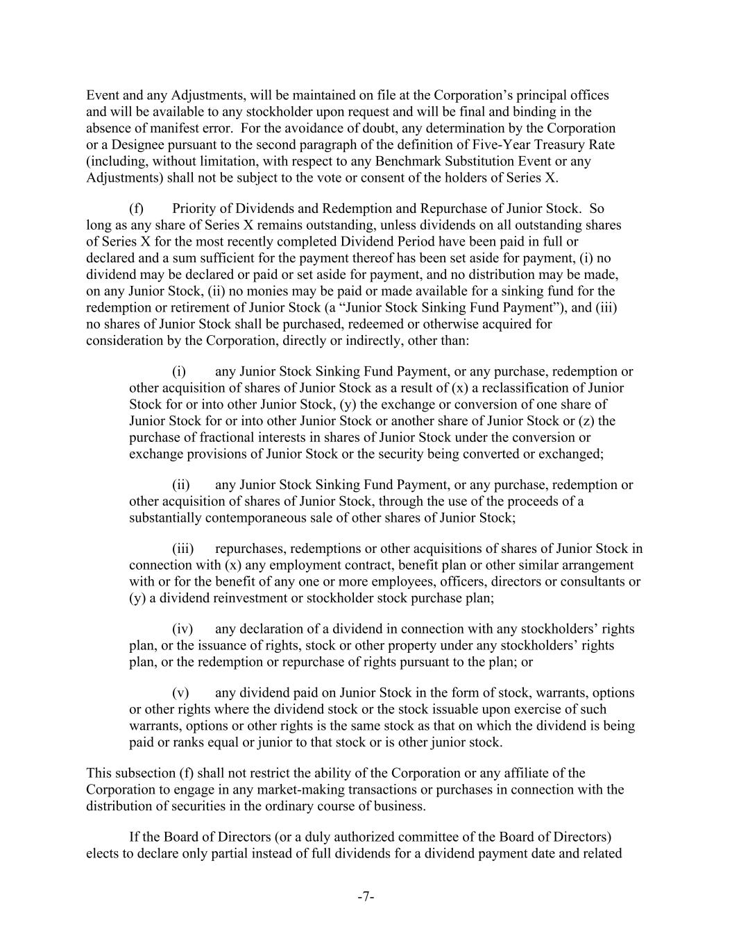 -7- Event and any Adjustments, will be maintained on file at the Corporation’s principal offices and will be available to any stockholder upon request and will be final and binding in the absence of manifest error. For the avoidance of doubt, any determination by the Corporation or a Designee pursuant to the second paragraph of the definition of Five-Year Treasury Rate (including, without limitation, with respect to any Benchmark Substitution Event or any Adjustments) shall not be subject to the vote or consent of the holders of Series X. (f) Priority of Dividends and Redemption and Repurchase of Junior Stock. So long as any share of Series X remains outstanding, unless dividends on all outstanding shares of Series X for the most recently completed Dividend Period have been paid in full or declared and a sum sufficient for the payment thereof has been set aside for payment, (i) no dividend may be declared or paid or set aside for payment, and no distribution may be made, on any Junior Stock, (ii) no monies may be paid or made available for a sinking fund for the redemption or retirement of Junior Stock (a “Junior Stock Sinking Fund Payment”), and (iii) no shares of Junior Stock shall be purchased, redeemed or otherwise acquired for consideration by the Corporation, directly or indirectly, other than: (i) any Junior Stock Sinking Fund Payment, or any purchase, redemption or other acquisition of shares of Junior Stock as a result of (x) a reclassification of Junior Stock for or into other Junior Stock, (y) the exchange or conversion of one share of Junior Stock for or into other Junior Stock or another share of Junior Stock or (z) the purchase of fractional interests in shares of Junior Stock under the conversion or exchange provisions of Junior Stock or the security being converted or exchanged; (ii) any Junior Stock Sinking Fund Payment, or any purchase, redemption or other acquisition of shares of Junior Stock, through the use of the proceeds of a substantially contemporaneous sale of other shares of Junior Stock; (iii) repurchases, redemptions or other acquisitions of shares of Junior Stock in connection with (x) any employment contract, benefit plan or other similar arrangement with or for the benefit of any one or more employees, officers, directors or consultants or (y) a dividend reinvestment or stockholder stock purchase plan; (iv) any declaration of a dividend in connection with any stockholders’ rights plan, or the issuance of rights, stock or other property under any stockholders’ rights plan, or the redemption or repurchase of rights pursuant to the plan; or (v) any dividend paid on Junior Stock in the form of stock, warrants, options or other rights where the dividend stock or the stock issuable upon exercise of such warrants, options or other rights is the same stock as that on which the dividend is being paid or ranks equal or junior to that stock or is other junior stock. This subsection (f) shall not restrict the ability of the Corporation or any affiliate of the Corporation to engage in any market-making transactions or purchases in connection with the distribution of securities in the ordinary course of business. If the Board of Directors (or a duly authorized committee of the Board of Directors) elects to declare only partial instead of full dividends for a dividend payment date and related